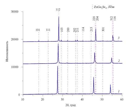 Рис. 5. Рентгенограммы продуктов совместного взаимодействия йодида галлия(III) и йодида цинка(II) с селеном при 450°С в течение 1 (1), 2 (2) и 3 (3) ч (пунктирные линии соответствуют положению рефлексов ZnGa2Se4 (PDF 47-1590) [23]).