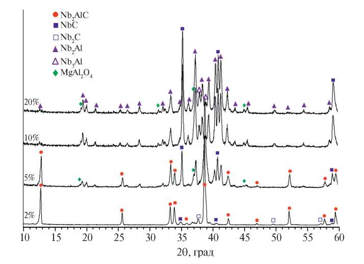 Влияние добавки Mg–Mg(ClO4)2. В результате введения в базовую шихту I более 2% подогревающей добавки Mg–Mg(ClO4)2 происходит горение смеси. При Х < 2% горение шихты в самораспространяющемся режиме не наблюдается. Фазовый состав продукта синтеза существенно зависит от Х (рис. 1). Оказалось, что при 10 и 20% добавки МАХ-фаза Nb2AlC не образуется, а в составе продукта присутствуют фазы NbC, Nb2Al, Nb3Al и MgAl2O4. При снижении количества добавки до 2 и 5% на дифрактограммах продукта появляются рефлексы Nb2AlC, однако присутствует также фаза MgAl2O4 (рис. 1). Формирование шпинели связано с окислением Al и Mg перхлоратом магния с образованием Al2O3 и MgO, которые при высокой температуре синтеза взаимодействуют друг с другом. Шпинель не подвергается кислотному выщелачиванию, поэтому для получения целевого продукта Nb2AlC с минимальным содержанием вторичных фаз использовалась смесь IV с содержанием подогревающей добавки 2%. Это количество обеспечивало горение базовой шихты и приводило к минимальному содержанию MgAl2O4 в составе продукта. Следующим шагом оптимизации состава смеси IV было уменьшение содержания углерода. На рис. 1 приведены дифрактограммы продукта горения смеси III при различном содержании X подогревающей добавки Mg–Mg(ClO4)2. Продукт подвергали кислотному выщелачиванию.
