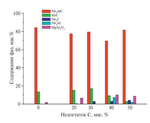 Таким образом, оптимальным составом, обеспечивающим максимальный выход целевой фазы Nb2AlC ~82%, является состав с 50%-ным недостатком углерода в смеси (табл. 2, № 5). На рис. 2 показано влияние недостатка углерода в смеси IV на фазовый состав продукта после кислотного выщелачивания в H2SO4 в течение 2 ч при 120–140°C. На рис. 3 приведена дифрактограмма (экспериментальная, расчетная и разностная) продукта после выщелачивания при 50%-ном недостатке углерода в смеси.