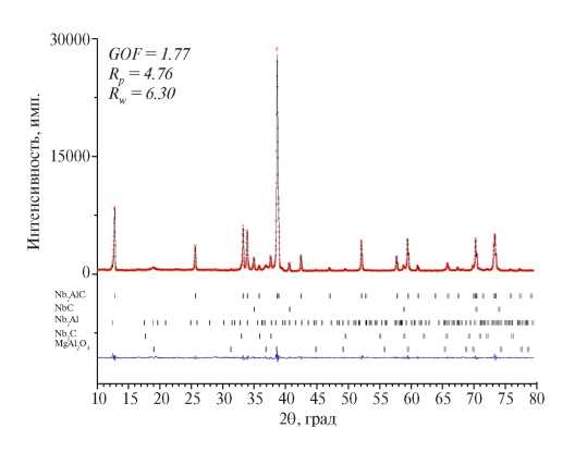 Дифрактограмма порошка (рис. 3) свидетельствует о высокой степени кристалличности структуры Nb2AlC (пр. гр. P63/mmc). Параметры элементарной ячейки составили a = 3.1079(1)Å и с = 13.8815(4)Å.