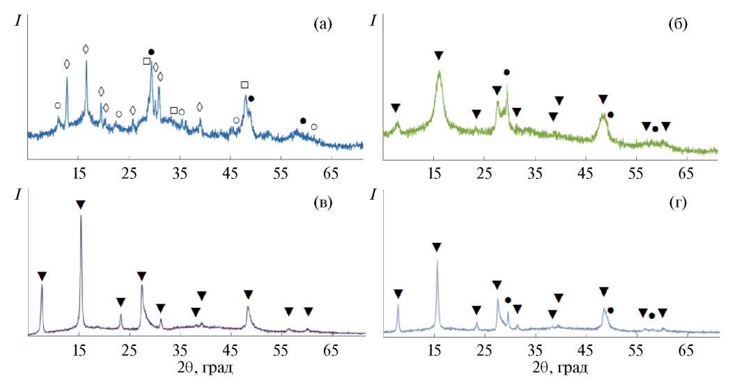 Рис. 1. Фрагменты рентгеновских дифрактограмм некоторых образцов (табл. 1): а –1; б –2; в –5; г –7: – хейкокит Cu4Fe5S8 (PDF #71–0367), ▼– валлериит CuFeS2·1.53[(Mg,Al)(OH)2] (PDF #29–0554), ◊ – эрдит NaFeS2·2H2O (PDF #33–1254), ○ – Mg6Al2(OH)18·4.5H2O (PDF #35–0965), ● – халькопирит CuFeS2 (PDF #83–0983).