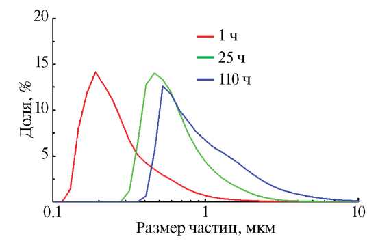 Рис. 2. Распределение частиц по размерам по результатам лазерной дифракции для образцов (табл. 1) с различным временем гидротермальной обработки.