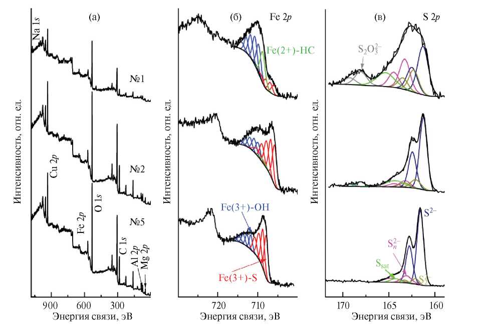 Спектры высокого разрешения линий 2р серы (рис. 6в) показывают снижение количества полисульфидной серы с ростом времени гидротермальной обработки. Это может быть связано с уменьшением удельной поверхности материала и, следовательно, сокращением количества сорбированной на поверхности окисленной серы. В образце с малым временем гидротермальной обработки (№1 в табл. 1) обнаружена сера в виде тиосульфат-иона.