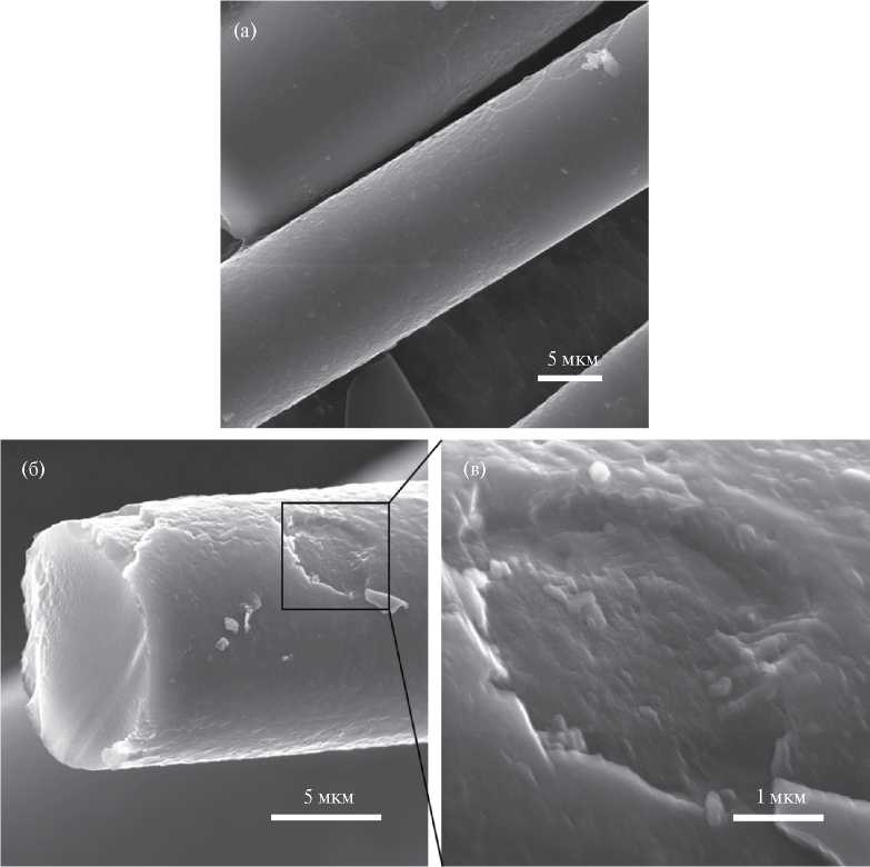 На рис. 3а представлен СЭМ-снимок исходных карбидокремниевых волокон. Видно, что поверхность волокон гладкая, крупные дефекты редки. Диаметры исходных волокон, взятых из разных катушек, в двух выборках по 121 и 124 штуки элементарных волокон составили 12.6 ± 0.4 мкм и 13.5 ± 0.5 мкм соответственно. Различие может быть связано с некоторой нестабильностью экспериментальных параметров получения волокон. Таким образом, по фазовому и элементному составу, по морфологическим особенностям поверхности, а также диаметру карбидокремниевое волокно, разработанное отечественными производителями, наиболее близко стоит к волокнам первого поколения зарубежных производителей (рис. 1).