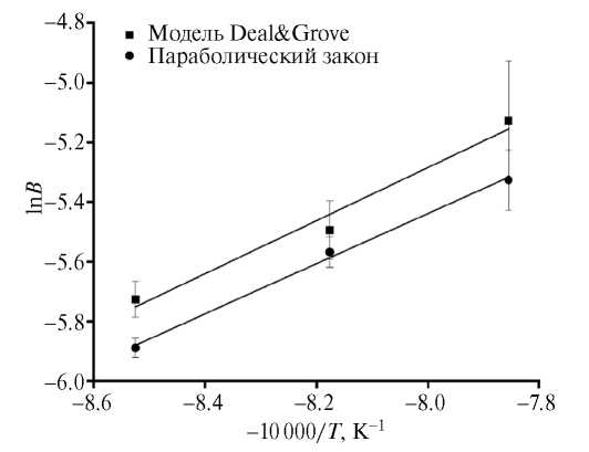 Кинетические параметры окисления были рассчитаны по двум моделям: Zhu et al. [8] и Deal & Grove [13], разработанным для цилиндрических SiC-волокон и плоских образцов кремния соответственно.
