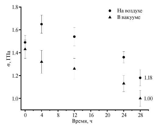 Рис. 8. Зависимости средней прочности волокон от времени обработки при 1000°С в вакууме и на воздухе.