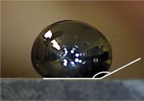 Измерение краевых углов смачивания материалов расплавом стекла Ge28Sb12Se60. Измерение краевых углов смачивания различных материалов халькогенидным расплавом осуществлялось методом сидячей капли в атмосферных условиях. Образец стекла массой 0.05–0.07 г помещался на подложку и плавился при заданной температуре. Система выдерживалась при данной температуре до достижения краевым углом стационарного значения, после чего образующаяся капля фотографировалась с помощью цифрового USB-микроскопа Micmed 2.0, и по полученному изображению с помощью компьютерной программы PicPick определялся краевой угол смачивания θ. Пример изображения капли расплавленного стекла приведен на рис. 2.