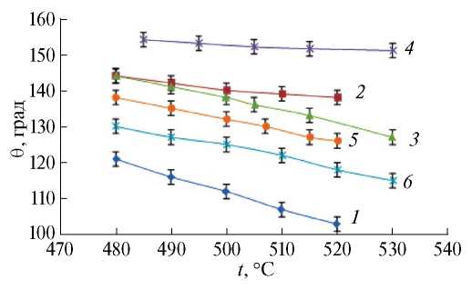 Рис. 4. Температурные зависимости краевых углов смачивания исследуемых материалов расплавом стекла Ge28Sb12Se60. 1 – сталь AISI 201, 2 – сталь AISI 201 с азотированной поверхностью, 3 – сталь AISI 430, 4 – сталь AISI 430 с азотированной поверхностью, 5 – титан, 6 – сплав ВК8.