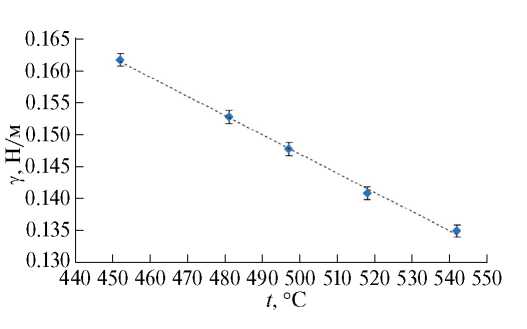 Рис. 5. Температурная зависимость поверхностного натяжения расплава стекла Ge28Sb12Se60.