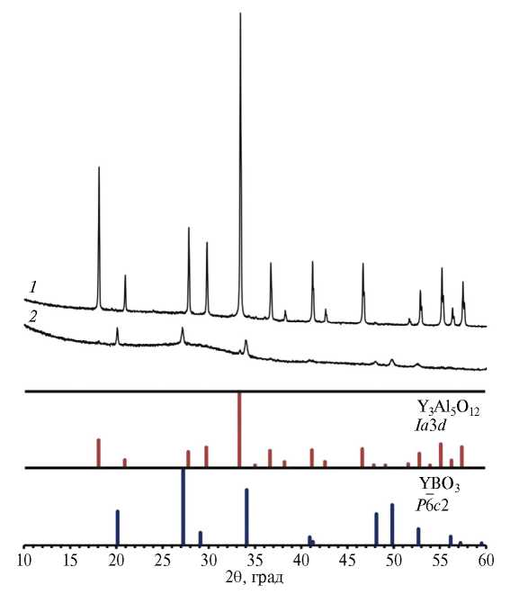 Рис. 2. Рентгенограммы образцов, сформированных методом СЛС из 100%-ного граната (1), из ультрадисперсной шихты 10% граната+90% стекла (2); идентифицированные кристаллические фазы: 1 – Y3Al5O12 (PDF 33–0040), 2 – YBO3 (PDF 74–1929) иY3Al5O12 (PDF 33–0040).