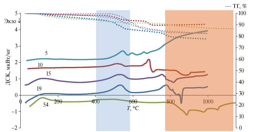 Рис. 4. ДСК-кривые нагревания со скоростью 10 K/мин ультрадисперсной шихты x(Er0.5Y0.5AG)–(100-x)∙(20Bi2O3–60B2O3–20BaO) при x = 5, 10, 15, 19, 54 мол. % (температурный диапазон расстекловывания отмечен светло синим фоном, а кристаллизация выделена бежевым фоном).