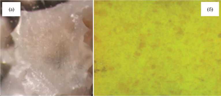 Нагревание гомогенизированной шихты с 5 и 95 мол. % до 950 °С позволило термически сформировать стеклокерамику (рис. 5а). Для сравнения отметим, что нагревание механической смеси дробленого стекла и предварительно сформированного при температуре 1150 °С дисперсного граната приводит к кристаллизации стекла с образованием Y-замещенного оксида висмута желтого цвета (рис. 5б и 6).