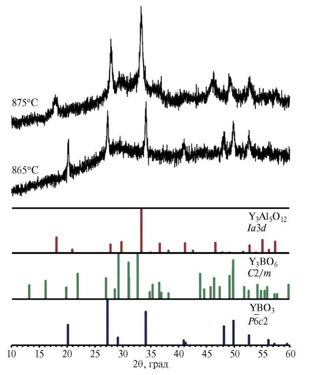Рис. 7. Рентгенограммы образцов, полученных из спрессованной шихты двух мольных соотношений граната и стекла x(Er0.5Y0.5AG)–(100-x)∙(20Bi2O3–60B2O–20BaO): x = 5 (865 °С) и x = 54 (875 °С); идентифицированные кристаллические фазы: 865 °С – YBO3 (PDF 74–1929), 875 °С – Y3Al5O12 (PDF 33–0040), YBO3 (PDF 74–1929), Y3BO6 (PDF 34–0291).