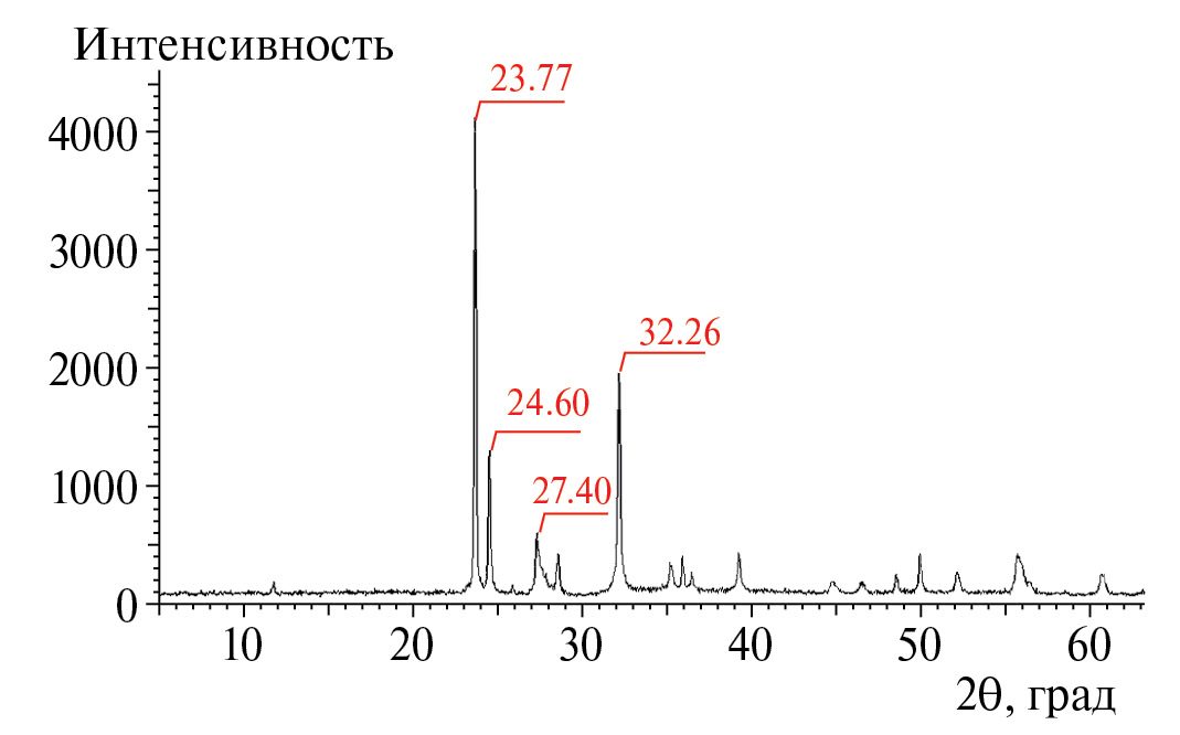 После синтеза поликристаллы проверяли на однофазность методами рентгенофазового и микроструктурного анализов. Измерения проводились на приборе BRUKER XRD D2-PHASER. Точность определения угла составляла 0.1°, погрешность подсчета импульсов равнялась 6. Классификацию и анализ дифрактограмм проводили с помощью программ EVA и TOPAZ-4.2.