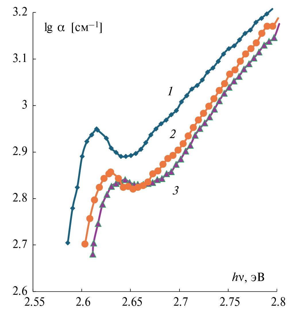 Рис. 2. Форма края поглощения монокристаллов TlGaS2<0.1% Pr> при 100 (1), 140 (2), 200К (3).