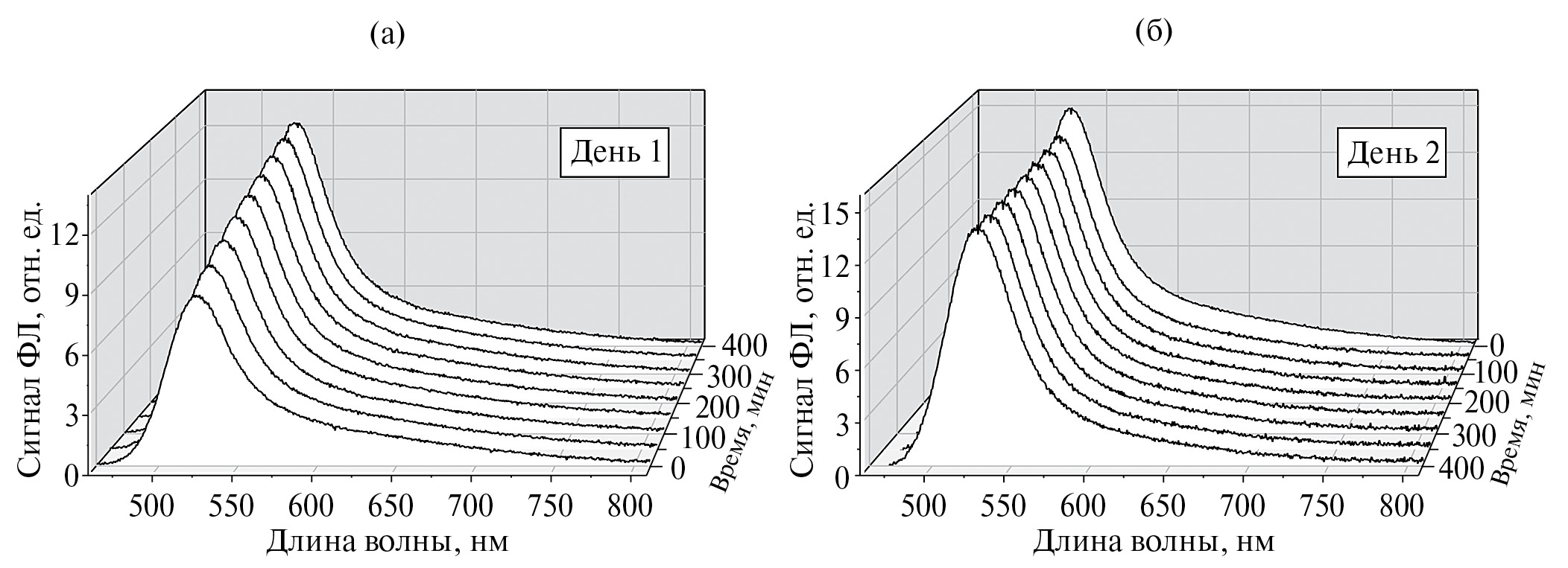 Для исследования временной динамики интенсивности ФЛ КТ CdTe/SiO2 регистрировали спектры ФЛ при непрерывном оптическом возбуждении в течение длительного времени. Эксперимент проводился в два этапа (два дня). В первый день (“День 1”) каждые 5 мин регистрировали спектры ФЛ КТ при непрерывном облучении светодиодом в течение 7 ч. Затем возбуждающее излучение выключали на 1 день. Во второй день (“День 2”) КТ повторно облучали в течение 7 ч и регистрировали спектры ФЛ аналогично первому дню.