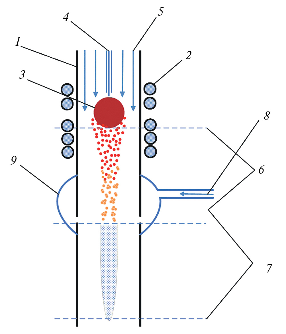 Рис. 1. Схема реактора: 1 – кварцевый реактор, 2 – противоточный индуктор, 3 – левитирующий образец, 4 – железная проволока, 5 – поток инертного газа, 6 – зона испарения и конденсации, 7 – зона реакции, 8 – ввод реакционного газа, 9 – кольцевой зазор.