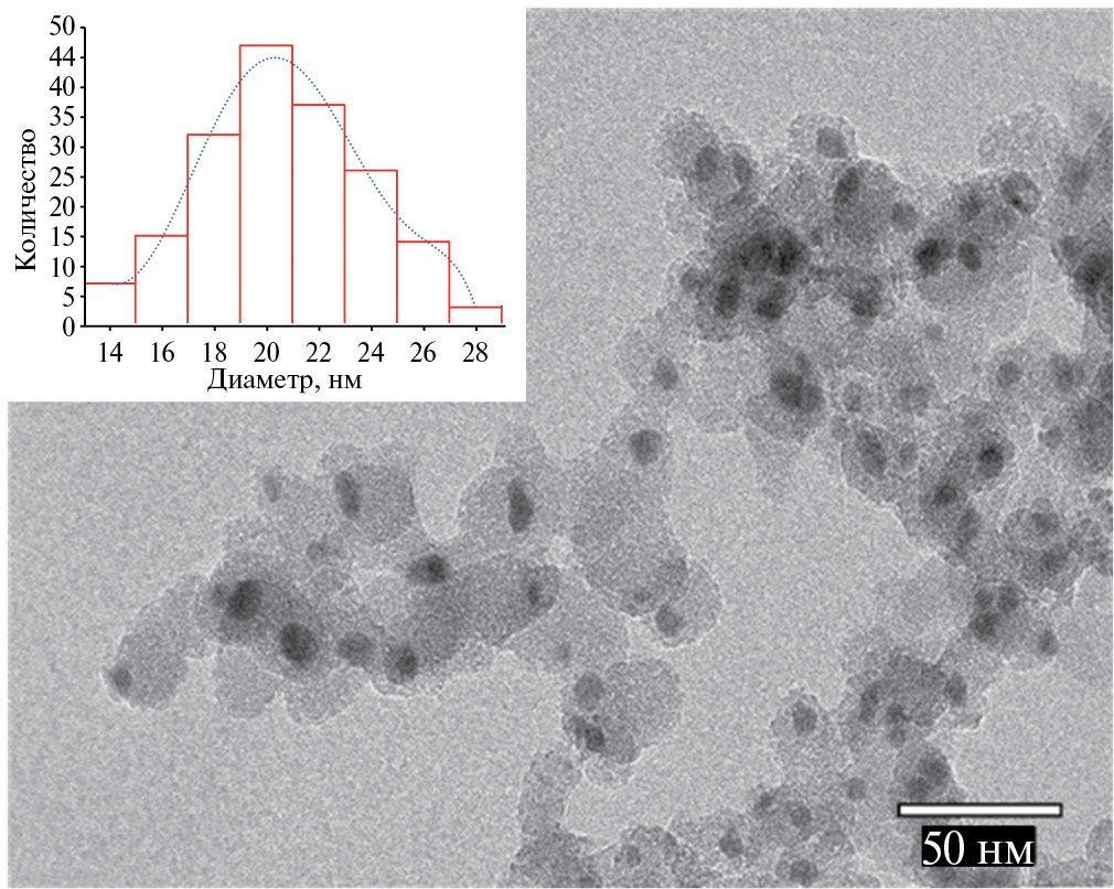 На рис. 7 представлено распределение наночастиц “ядро/оболочка” Fe@Fe3C. Анализ распределения наночастиц с усредненным удельным размером в 24 нм указывает на их монодисперсность, однако наблюдаются более крупные частицы, примерно 30 нм в диаметре.