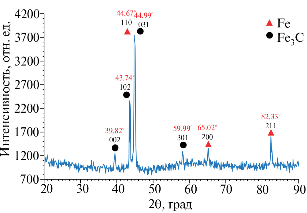 На рентгенограмме наночастиц Fe@Fe3C (рис. 5) присутствуют четыре дифракционных пика Fe3C при 2θ = 39.79°, 43.76°, 44.99° и 57.99°, которые соответствуют плоскостям (002), (102), (031) и (301) орторомбической структуры (пр. гр. Pnma) согласно PDF № 35-0772. Также на рентгенограмме присутствуют дифракционные максимумы железа при 2θ 44.64°, 65.02°, 82.33°, соответствующие плоскостям (110), (200) и (211) кубической сингонии (PDF №06-0696).