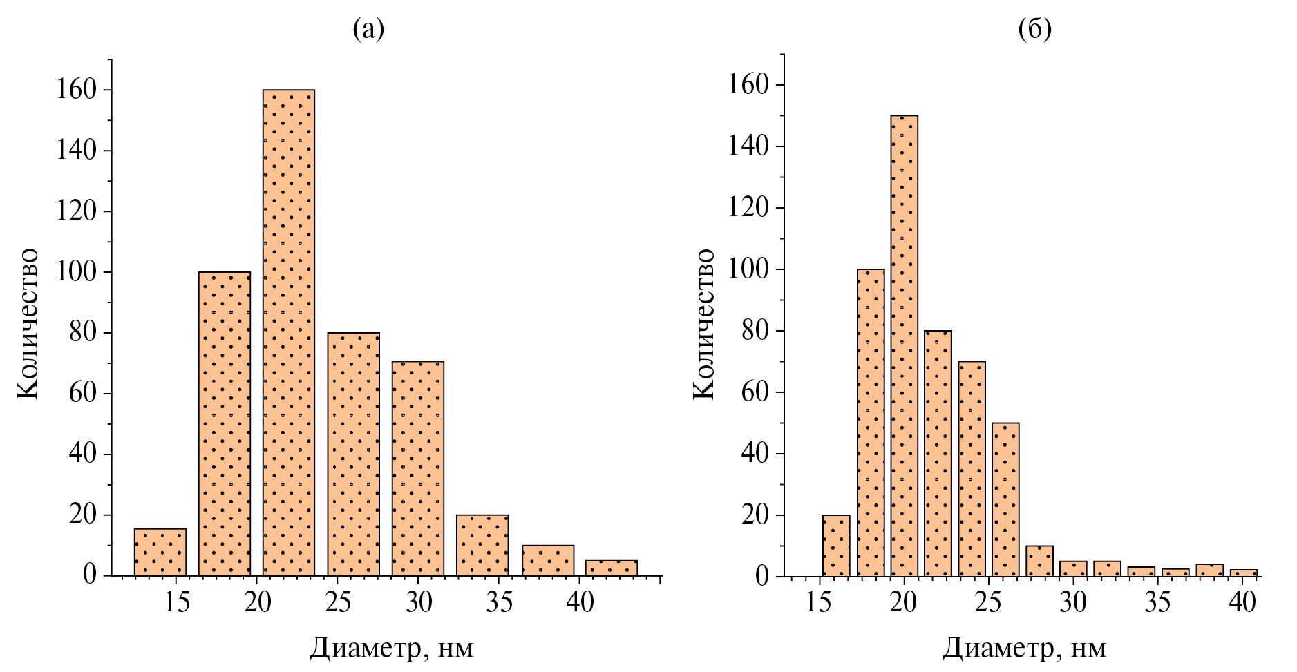 Рис. 7. Распределение наночастиц Fe@Fe3C, полученное методом ДРС: а – по количеству частиц, б – по интенсивности.