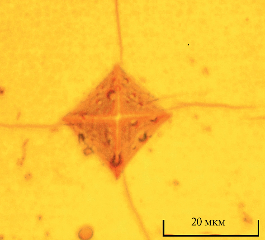 Твердость покрытий измеряли на микротвердомере ПМТ-3М при нагрузке 1.96 Н по методу Виккерса (рис. 2). Для оценки трещиностойкости покрытий использовали данные о количестве трещин, исходящих из углов отпечатков индентора, после испытания на микротвердость. Всего было сделано не менее 17 отпечатков на каждый образец. Поскольку максимальное количество трещин, выходящих из углов отпечатка, ограничено четырьмя, формула оценки трещиностойкости (ТС) выглядит следующим образом: