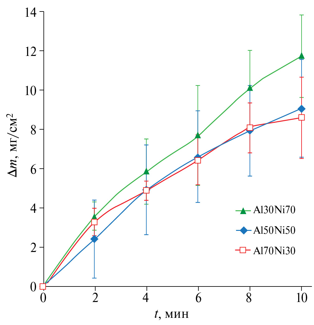 Изучение массопереноса важно при испытании новых электродных материалов для установления факта положительного привеса подложки (катода). В противном случае покрытие не формируется, так как скорость эрозии катода превышает скорость отложения анодного материала [19]. С ростом времени электроискровой обработки катоды из стали 35 непрерывно набирали массу (рис. 3). Средние значения привеса образцов Al50 и Al70 были практически одинаковыми, тогда как привес образца Al30 был самым высоким ‒ 11.7 мг/см2 за 10 мин обработки. Предыдущие исследования показали [12], что при использовании НЭ, состоящей из гранул Ni и Al без порошка, привес катода достигал от 0.43 до 3.3 мг/см2 за аналогичное время. Таким образом, результаты по массопереносу показывают, что добавление порошков многократно увеличивает привес катода. Это объясняется улучшением условий возникновения разрядов, когда снижается доля холостых импульсов и короткозамкнутых коммутаций в пользу увеличения доли разрядов.