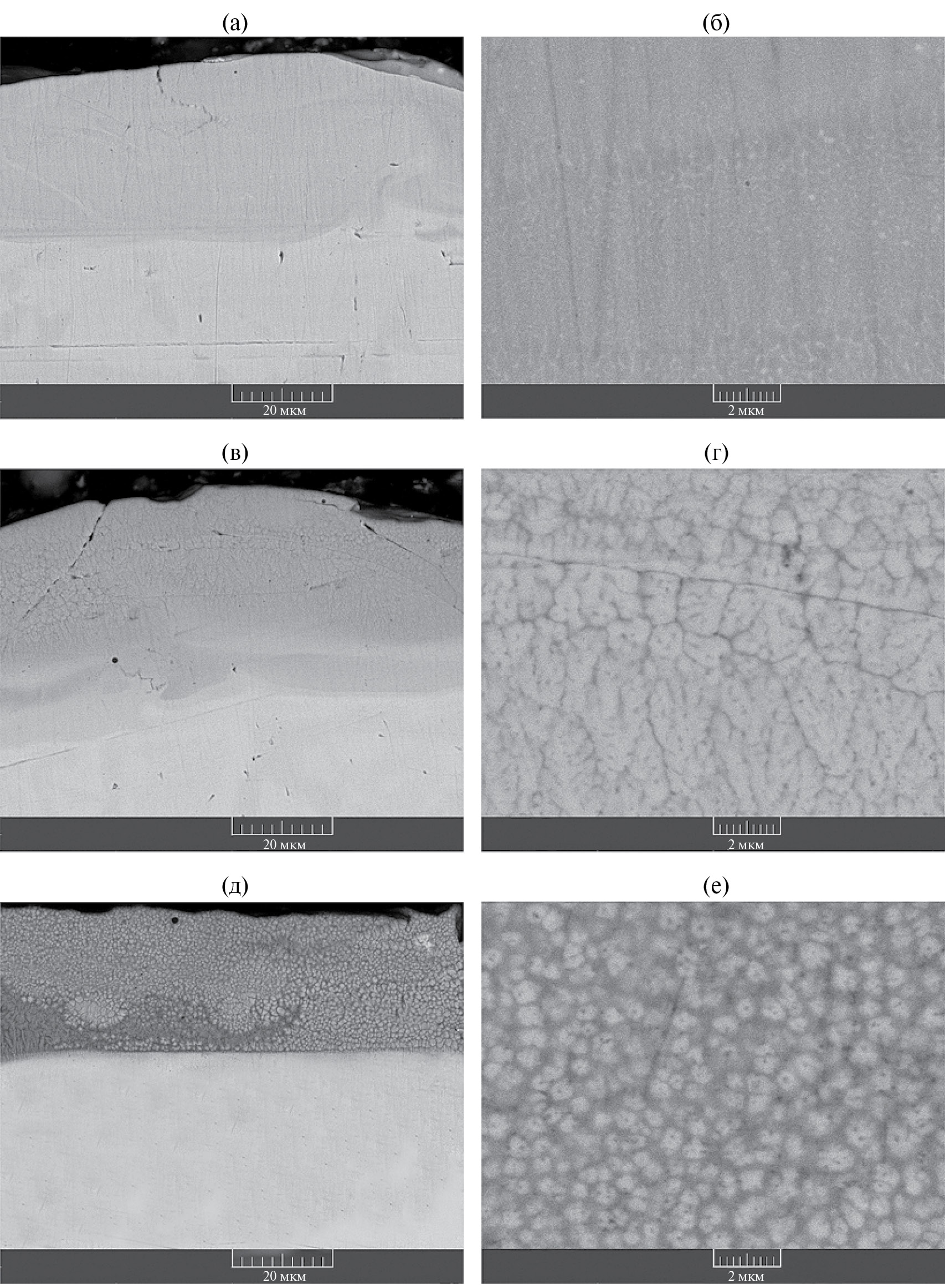 На рис. 4а, 4в, 4д показаны СЭМ-изображения поперечного сечения покрытий в режиме обратно отраженных электронов. Средняя толщина покрытий изменялась от 29 до 41.1 мкм (табл. 3). Покрытия имели плотную структуру без газовых пор со сравнительно узкими трещинами и редкими оксидными включениями. Вблизи переходной зоны наблюдаются области разного контраста, являющиеся следами конвективного перемешивания Ni и Al с железом подложки (рис. 3в). Покрытия Al30 и Al50 имеют плавный переход со сталью 35, что свидетельствует об их высокой адгезии к подложке (рис. 4в, 4г). Исследование микроструктуры покрытий показало, что в образце Al30 наблюдались редкие участки с мелкой ячеистой структурой с размером 02–0.5 мкм (рис. 4б). Сложное обнаружение участков микроструктуры в покрытии Al30 обусловлено малым размером зерен, что вызвано высокими скоростями охлаждения материала после окончания разряда при ЭИЛ. По этой причине трудно выявляемую структуру ЭИЛ покрытий называют “белым слоем” [20]. В покрытии Al50 наблюдались столбчатые дендриты, растущие преимущественно в латеральной плоскости в направлении от подложки к поверхности покрытия, т.е. противоположном отводу тепла (рис. 4г). Наиболее отчетливо микроструктура выявлялась в покрытия Al70 в виде ячеек диаметром 0.3–0.9 мкм, которые, вероятно, также являются столбчатыми дендритами, растущими преимущественно в базальной плоскости (рис. 4е).