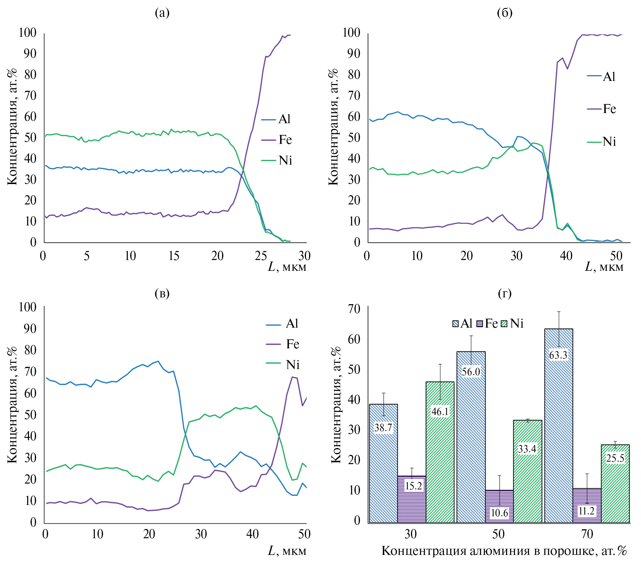 На рис. 5а–5в показаны профили концентраций элементов в сечении покрытий согласно ЭДС-анализу. Распределение Al и Ni по глубине покрытий было достаточно однородным, и только в переходной зоне концентрация железа возрастала. Были вычислены средние значения концентраций металлов в покрытиях по нескольким профилям распределения элементов на разных участках покрытия (рис. 5г). При повышении содержания порошка алюминия в НЭ от 30 до 70 ат. % его средняя концентрация в покрытиях монотонно возрастала с 39 до 63 ат. %, а концентрация никеля, напротив, снижалась с 46 до 26 ат. %. Из-за высокой концентрации никеля покрытие Al30 имело самый светлый оттенок на рис. 4а. С ростом содержания алюминиевого порошка в НЭ концентрация железа в покрытиях также снижалась с 15 до 11 ат. %. Железо проникает в покрытие вследствие конвективного перемешивания материала подложки с компонентами НЭ в микрованне расплава на катоде. Ранее показано, что порошковая форма гораздо активнее участвует в формировании покрытия по сравнению с объемными электродами [21]. Это объясняет невысокую концентрацию железа в Ni–Al-покрытиях. В целом диапазон концентраций Ni и Al в покрытии, регулируемый изменением соотношений никеля и алюминия в порошке, добавляемом к эквимолярной смеси гранул Ni и Al, ограничен участием материала гранул и стальной подложки в формировании легированного слоя. Применение порошков Ni и Al позволяет существенно сократить долю железа в покрытиях. Так, предыдущие исследования показали [12], что при использовании НЭ, состоящего из гранул Ni и Al без порошка, концентрация железа в покрытиях достигала 49 ат. %.