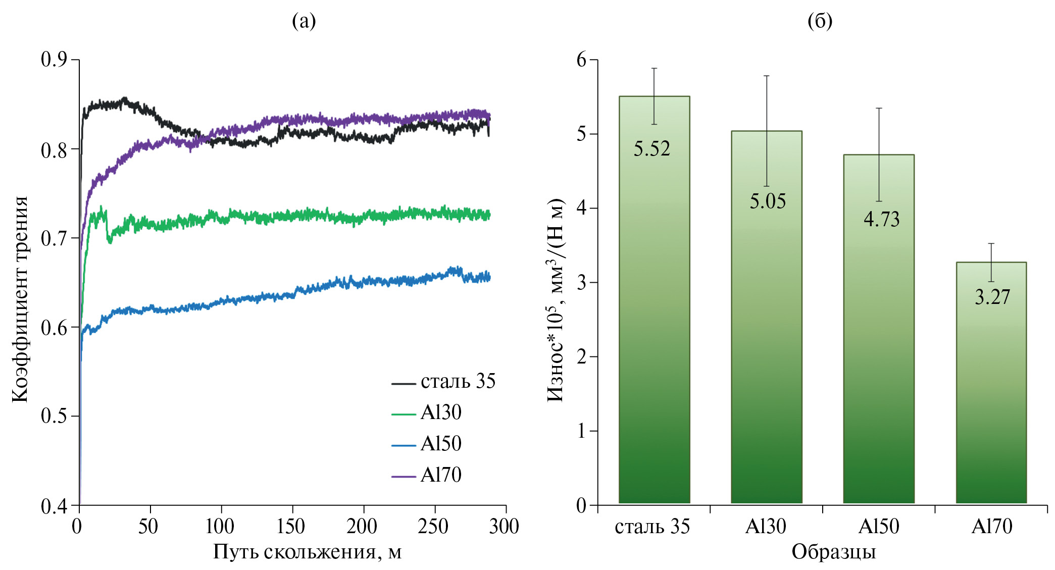 Динамика коэффициента трения покрытий при испытании на изнашивание в режиме сухого скольжения показана на рис. 7а. Средние значения коэффициента трения покрытий находились в диапазоне от 0.66 до 0.84, с минимумом у образца Al50. Наиболее высокий коэффициент трения был у образца с самой высокой концентрацией алюминия – Al70. Высокие значения коэффициента трения стали 35 согласуются с результатами работы [23], где показано, что коэффициент трения в паре сталь X210CrW12–инструментальная сталь GCr15 составляет 0.81 ± 0.13. Коэффициент трения покрытий Al30 и Al50 был ниже, чем у стали 35 (0.83). Это согласуется с результатами работы [24], где коэффициент трения Fe–Ni–Al-покрытий, полученных дуговой наплавкой, был ниже (0.34–0.42) по сравнению со сталью AISI1010 (0.53) при испытании с контртелом из быстрорежущей стали. Таким образом, их применение позволяет снизить коэффициент трения поверхности деталей из стали 35.