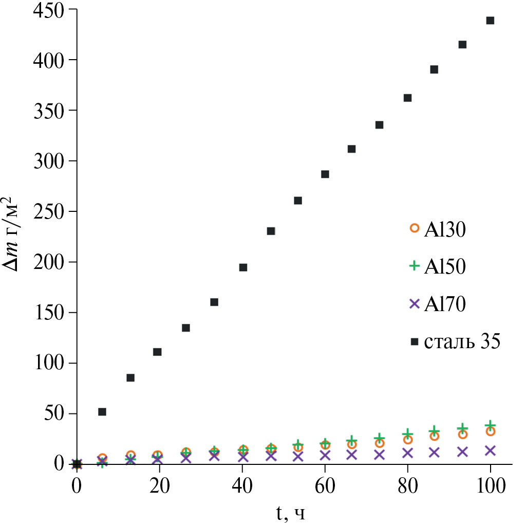 На рис. 10 показаны результаты испытаний образцов стали 35 c Ni–Al-покрытиями на циклическую жаростойкость при температуре 700°С. Привес образцов с покрытиями по результатам 100 ч испытаний составил от 12.9 до 46.6 г/м2. Привес в процессе высокотемпературного окисления обусловлен фиксацией кислорода на поверхности образцов с образованием гематита Fe2O3 [32]. Привес подложки без покрытия составил 439 г/м2. Таким образом, применение приготовленных Ni–Al-покрытий позволяет повысить жаростойкость изделий из стали 35 от 9 до 34 раз. Жаростойкость образцов с покрытиями увеличивалась в ряду Al50, Al30 и Al70. Таким образом, лучшую жаростойкость продемонстрировало покрытие с наибольшей концентрацией алюминия и наименьшим содержанием железа. Это подтверждается данными по Al–Ni–Fe-покрытиям, которые показали более низкую жаростойкость при температуре 700°С из-за более высокого содержания железа [12].