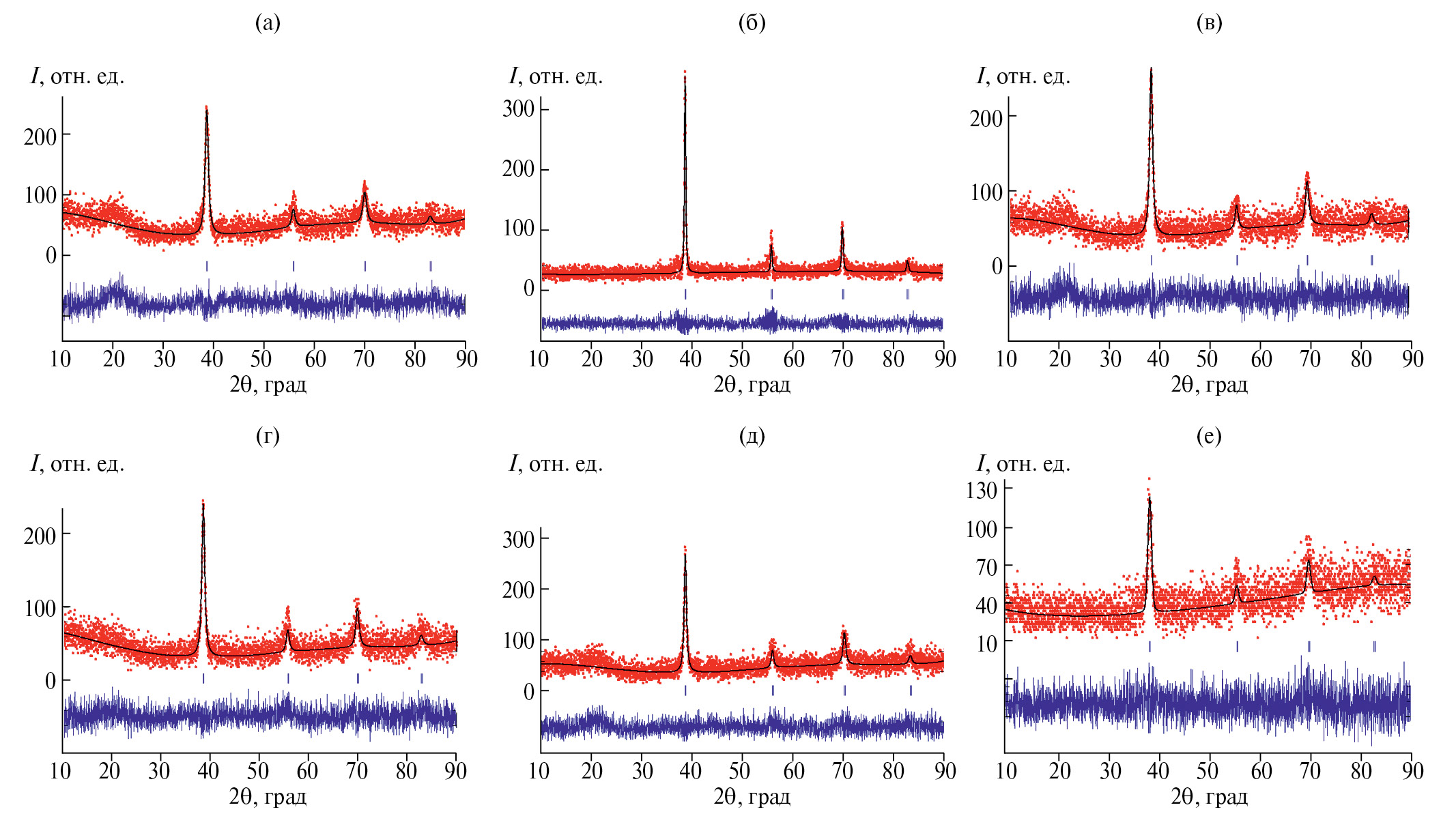 Рис. 2. Рентгенограммы гидридных фаз на основе ВЭС: а – TiZrNbTaMo (1.8 Н/М), б – TiZrNbTa(Mo0.8V0.2) (2.2 Н/М), в – TiZrNbTa(Mo0.6V0.4) (2.4 Н/М), г – TiZrNbTa(Mo0.4V0.6) (2.7 Н/М), д – TiZrNbTa(Mo0.2V0.8) (2.8 Н/М), е – TiZrNbTaV (2.9 Н/М), обработанные по методу Ритвельда (показаны экспериментальный (точки) и расчетный (верхняя линия) профили, разность между ними (нижняя линия), штрихи соответствуют брэгговским позициям).