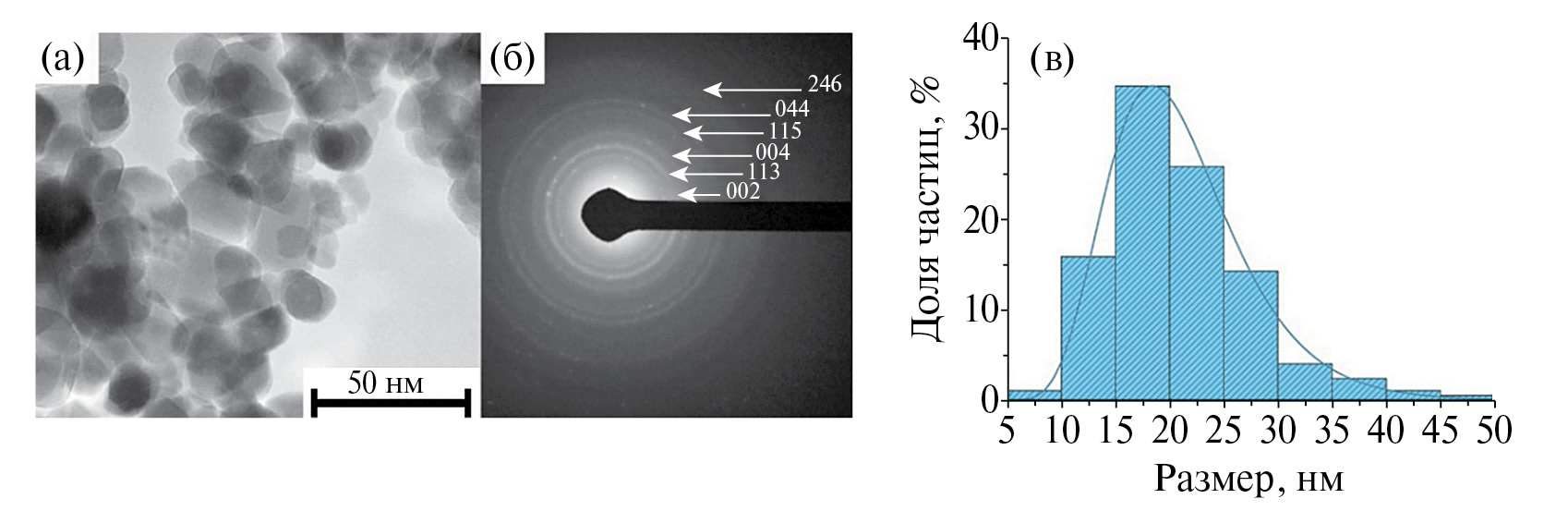 В ходе обработки при 850°С в течение 1 ч продуктов анионообменного осаждения сформировались однородные частицы размером 18.3 ± 0.4 нм (рис. 1а, 1в), представляющие собой, по данным электронной микродифракции (рис. 1б), однофазный СuFe2O4.