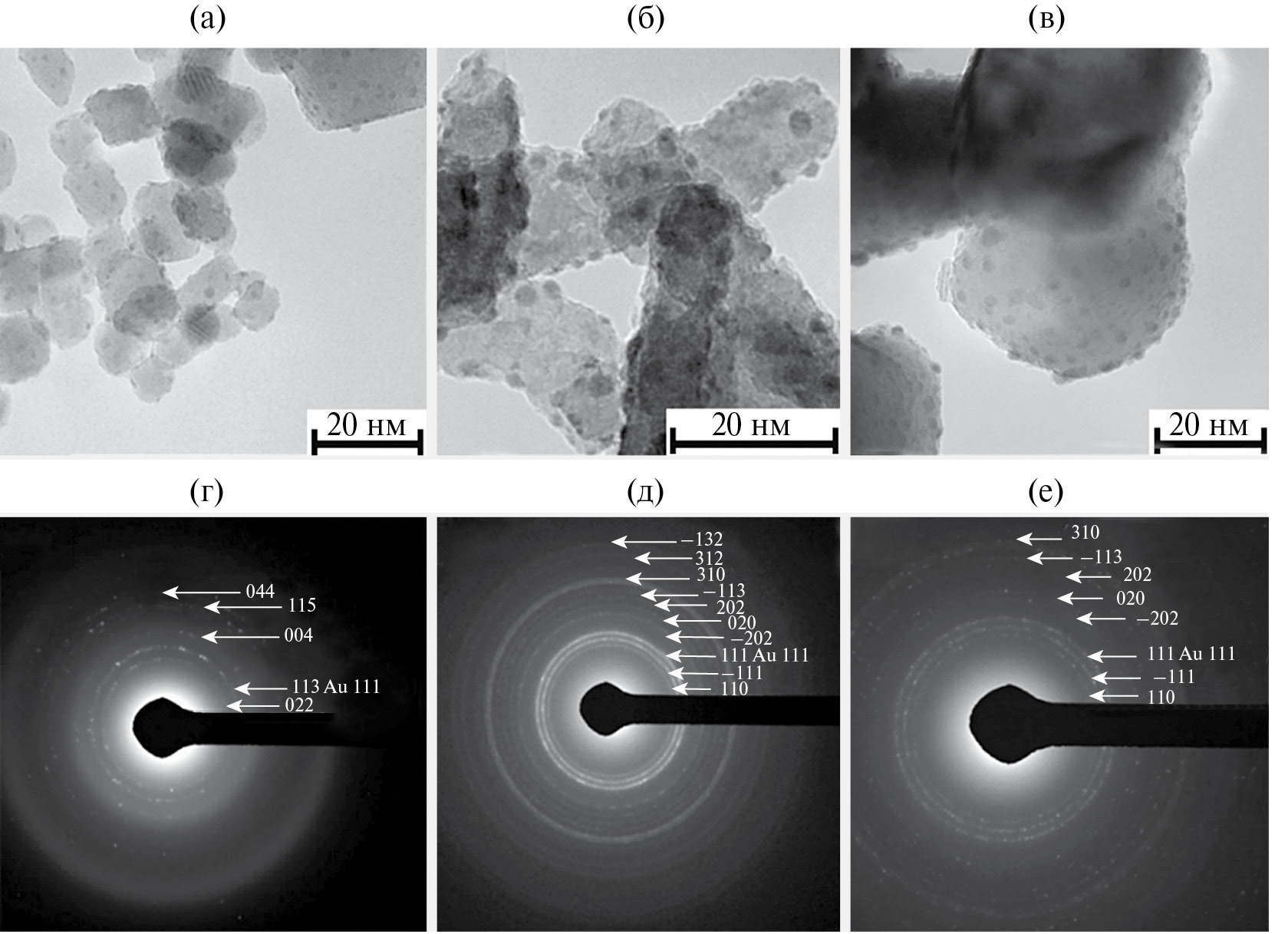 На рис. 5 показаны микрофотографии полученных гибридных наночастиц CuFe2O4/Au (рис. 5а) и CuO/Au (рис. 5в, д). На поверхности оксидов хорошо заметны имеющие более высокий контраст нанокластеры золота, что подтверждается электронным микродифракционным анализом (рис. 5б, г, е), энергодисперсионной рентгеновской спектроскопией (рис. 6а, б) и рентгенофазовым анализом (рис. 7).