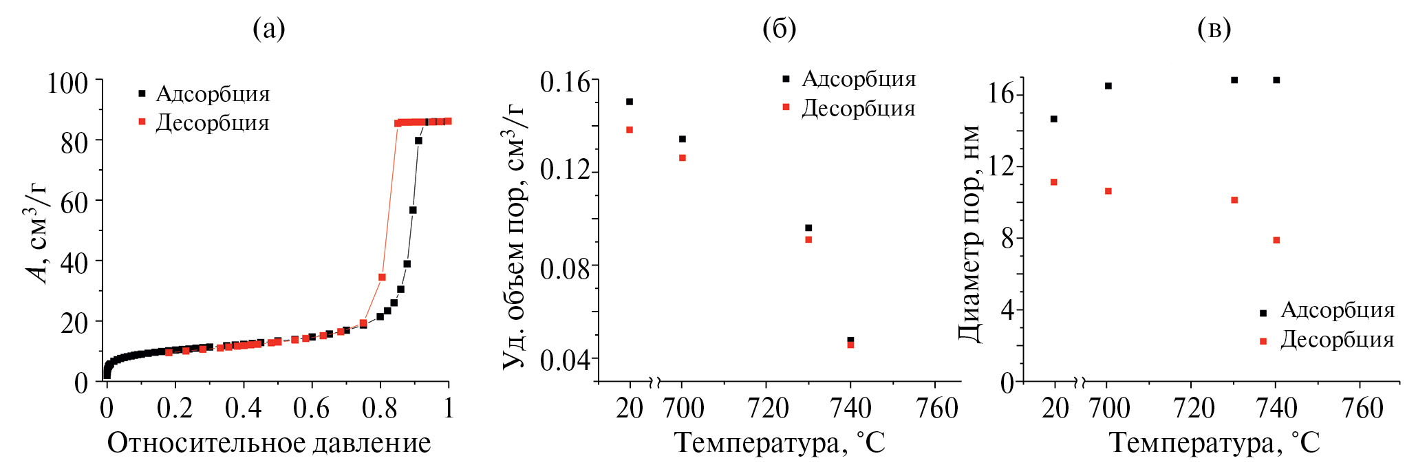 Визуальный осмотр показал наличие опалесценции в образцах, термообработанных вплоть до температуры 750°С, что является косвенным свидетельством пористой структуры. Термообработка при 775°С приводит к полному схлопыванию пор. Характер полученных изотерм адсорбции–десорбции азота, типичный вид которых приведен на рис. 1а, указывает на наличие полимолекулярной адсорбции и капиллярной конденсации [13], а также на бутылкообразную форму пор. Такая пора может быть описана как комбинация сферической и цилиндрической пор. Для пор такой формы адсорбционная ветвь изотермы позволяет оценить диаметр полости (сферы), а десорбционная – диаметр горла (цилиндра) [13]. На рис. 1б приведены температурные зависимости удельного объема пор, а на рис. 1в – диаметров внутренней полости и горловины пор для исходного НПС, а также образцов НПС-700, НПС-730, НПС-740. В табл. 1 представлены данные о среднем диаметре пор полости и горла, а также удельном объеме пор для исследованных образцов.