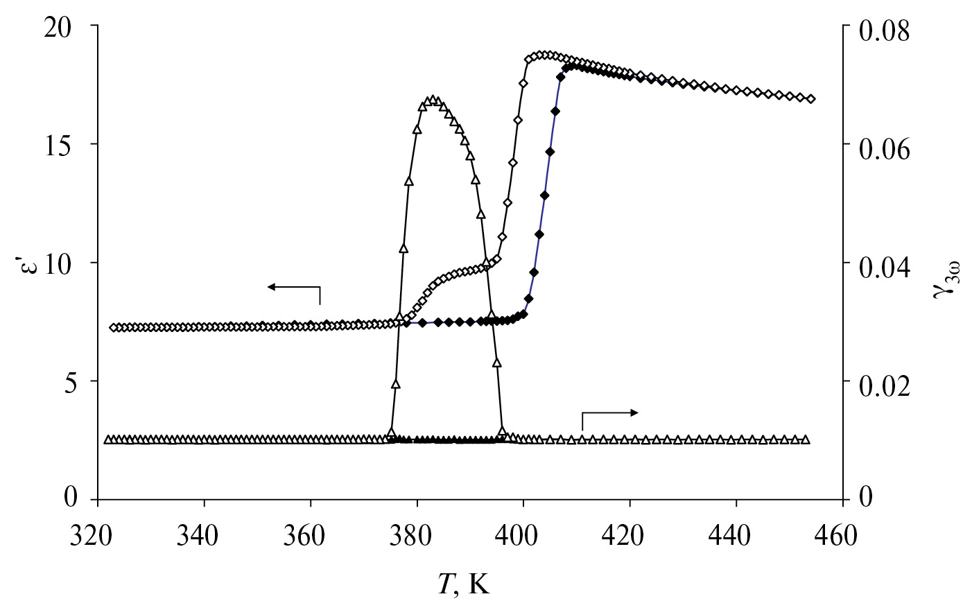 Как показали исследования зависимостей диэлектрической проницаемости εʹ и коэффициента третьей гармоники (γ3ω = U3ω / Uω) от температуры сегнетоэлектрическая фаза в нитрате калия возникает в процессе охлаждении при температуре 395 К и существует вплоть до 377 К (рис. 1).