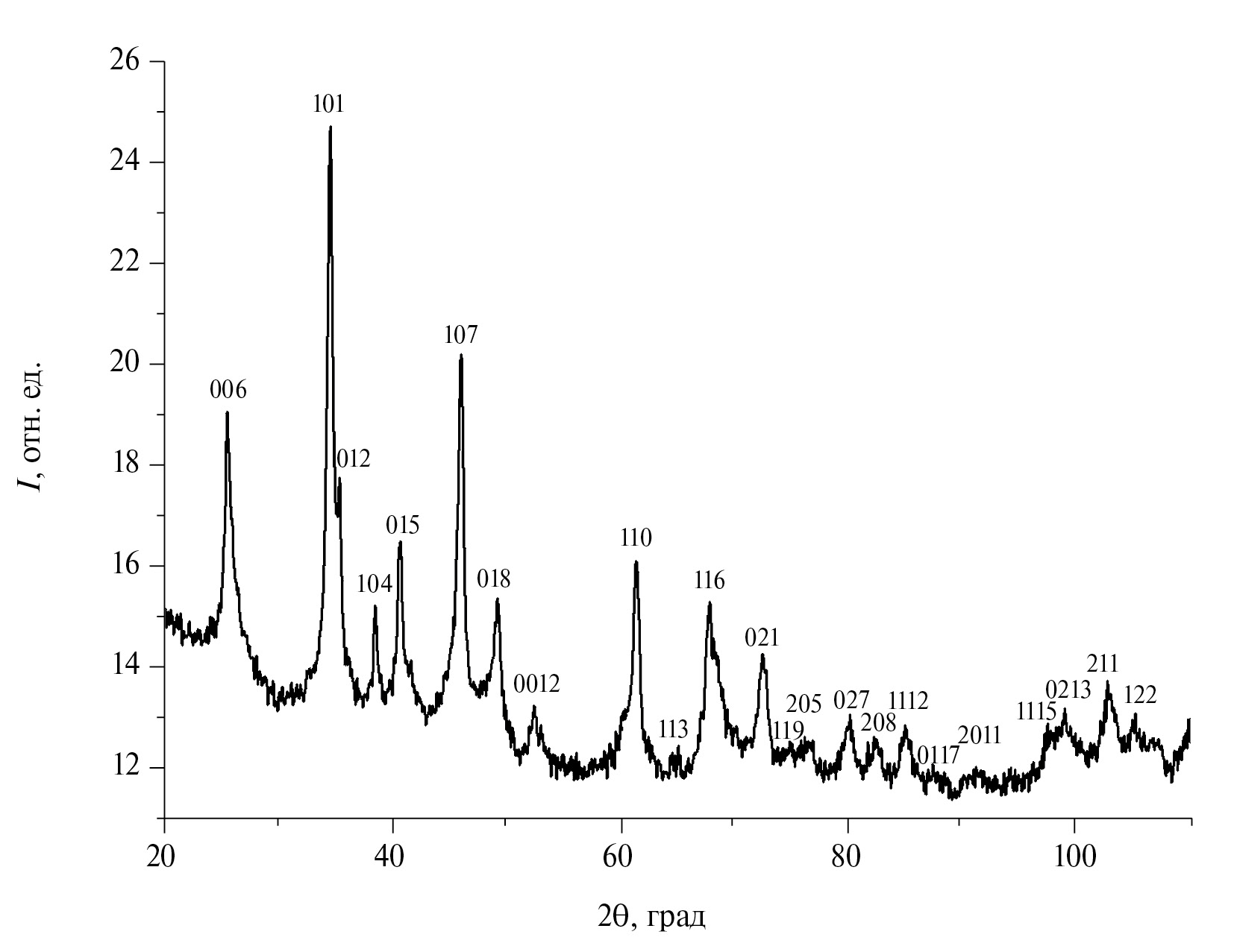 Рис. 1. Дифрактограмма наночастиц Mo2B5, полученных в ионном расплаве KBr.