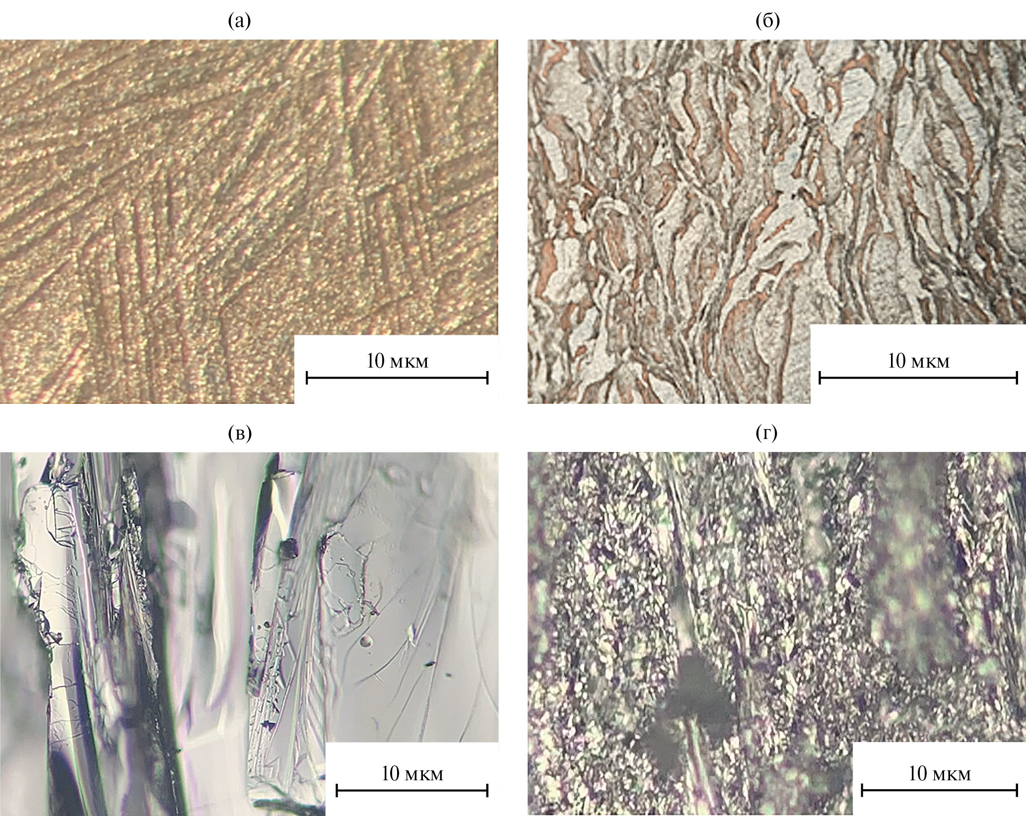 На рис. 2 представлены оптические микрофотографии шлифа (а, б) и сколов (в, г). На микрофотографиях твердого раствора Bi2Te2.5Se0.5 n-типа проводимости, полученного зонной перекристаллизацией, после травления (рис. 2а) явно просматривается слоистая структура. Плоскости спайности направлены вдоль оси выращивания и повернуты на некоторый угол относительно друг друга. В образцах, полученных экструзией (рис. 2б), также наблюдается слоистая структура, направленная вдоль оси вытяжки, в комбинации с мелкими кристаллитами. Размер слоистого зерна составил не более 5 мкм. Микрофотографии сколов образцов Bi2Te2.5Se0.5, полученных зонной перекристаллизацией (рис. 2в) и экструзией (рис. 2г), существенно различаются как по морфологии, так и по размеру зерна. Экструдированные образцы обладают более мелкозернистой структурой и высокой степенью упаковки.