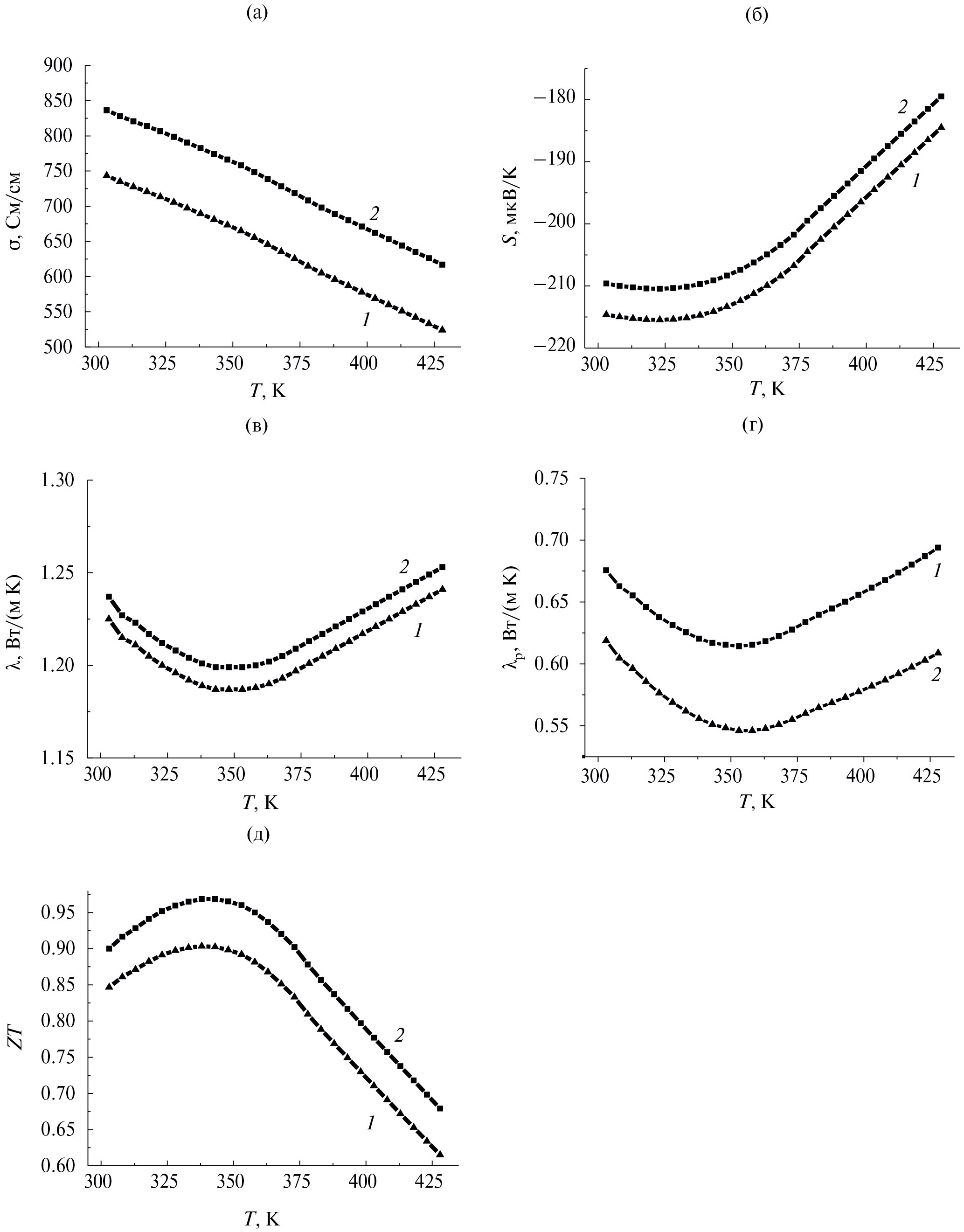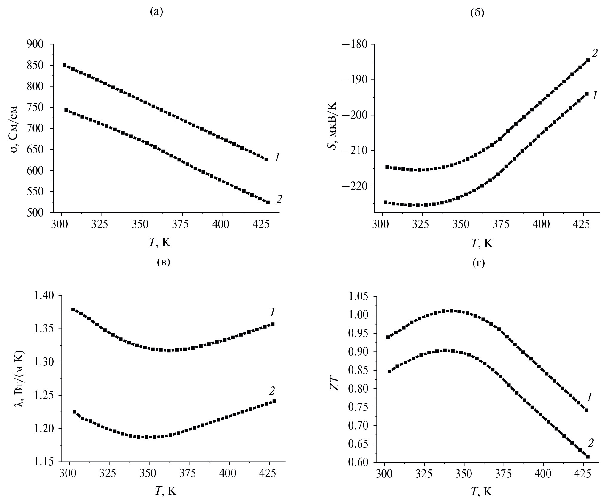 Несмотря на низкие показатели электрической проводимости и коэффициента Зеебека, экструдированные образцы (кривые 2 на рис. 5а, 5б) не сильно уступают по характеристикам добротности ZT зонно-выращенным (кривая 1 на рис. 5г) вследствие низкой теплопроводности.