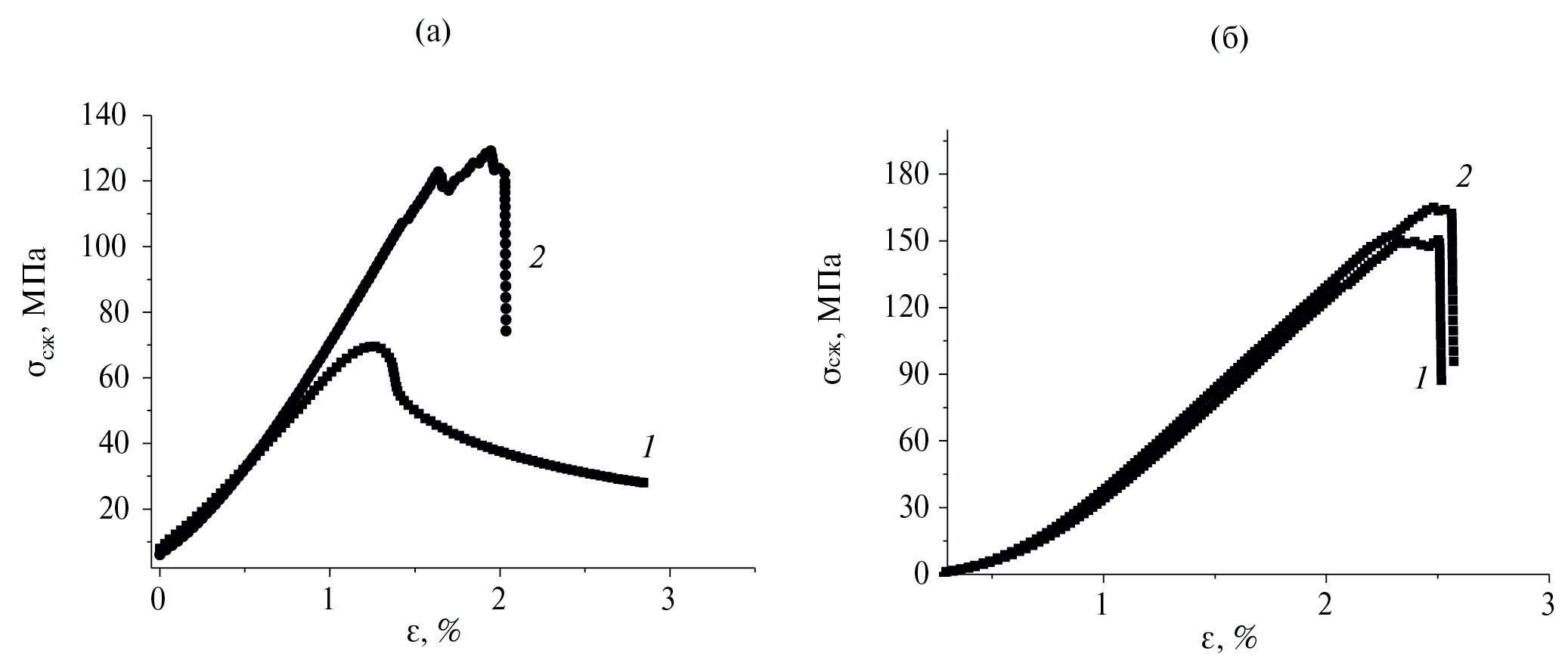 Рис. 7. Кривые σсж–e образцов Bi2Te2.5Se0.5 в исходном состоянии, полученных экструзией (2), зонной перекристаллизацией (1) (а), а также экструдированных образцов до (1) и после термообработки при температуре 573 К в течение 24 ч (2) (б).