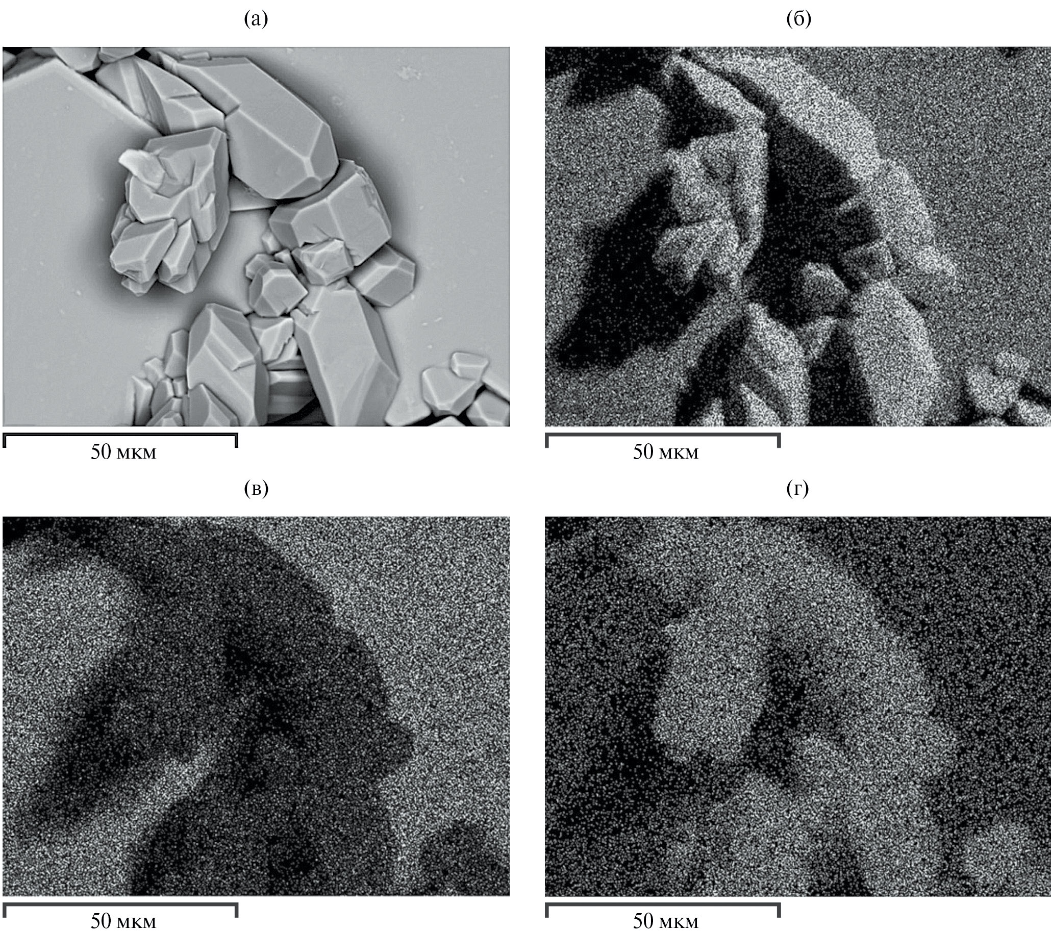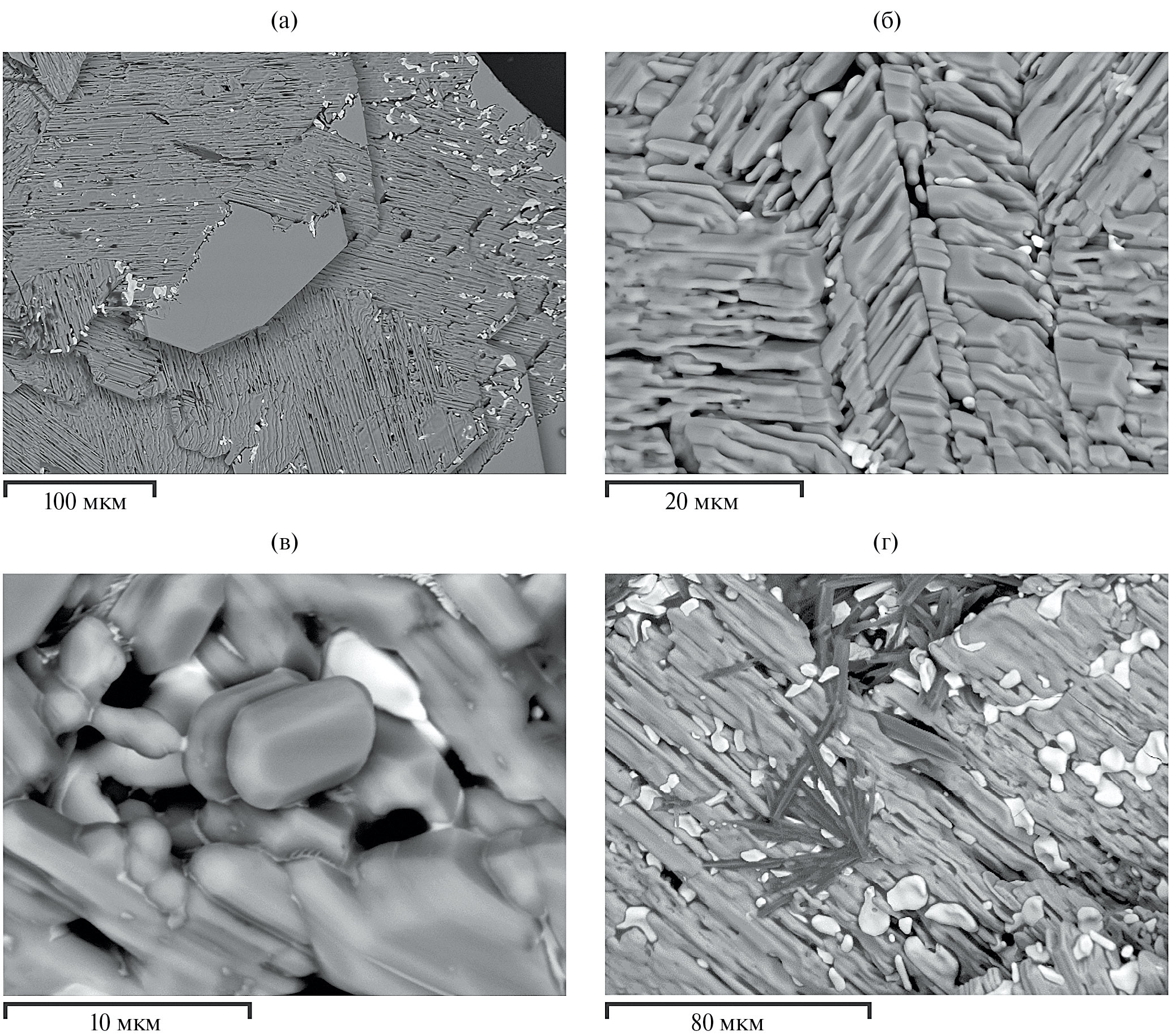 При увеличении времени выдержки кристаллов до 2 сут при этой же температуре количество указанных фаз принципиально не меняется. Вместе с тем отмечено текстурирование поверхности, не сопровождающееся появлением дополнительного контраста на изображениях в отраженных электронах (рис. 7а). При этом на исходно гладкой поверхности пластинчатых кристаллов Nd-Al-диметабората появляются серии достаточно глубоких борозд, формирующих четкие контуры удлиненных новообразованных индивидов неодим-алюминиевого ортобората NdAl3(BO3)4, ориентированных друг относительно друга по принципу паркетной укладки (рис. 7б, 7в). При увеличении времени выдержки при этой температуре до 5 сут степень обособленности индивидов повышается, некоторые из них приобретают четкую огранку (рис. 7в), свойственную кристаллам низкотемпературной тригональной модификации РЗ-алюминиевых боратов. Параллельно с этим наблюдается незначительное увеличение их содержания в продуктах разложения фаз Al18B4O33 и NdBO3 (рис. 7г).