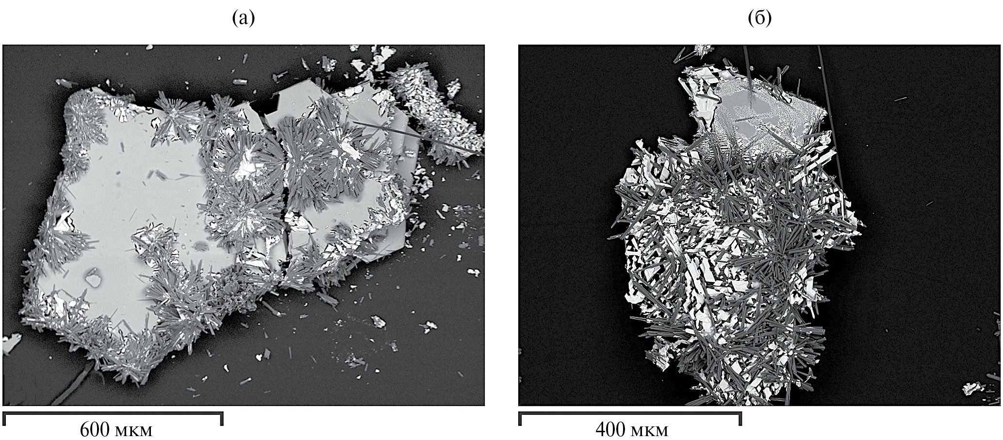 В отличие от лантанового представителя после отжига Nd-Al-диметабората при 960°С в течение 1 сут на сколах, границах слоев роста и других неоднородных участках поверхности кристаллов отчетливо фиксируются одновременно обе новообразованные фазы (рис. 6). В большинстве случаев они совместно формируют своеобразные гнезда (рис. 6б). Вне скоплений новообразованных кристаллов поверхность исходного образца Nd-Al-диметабората не изменена в пределах разрешающей способности электронного микроскопа.