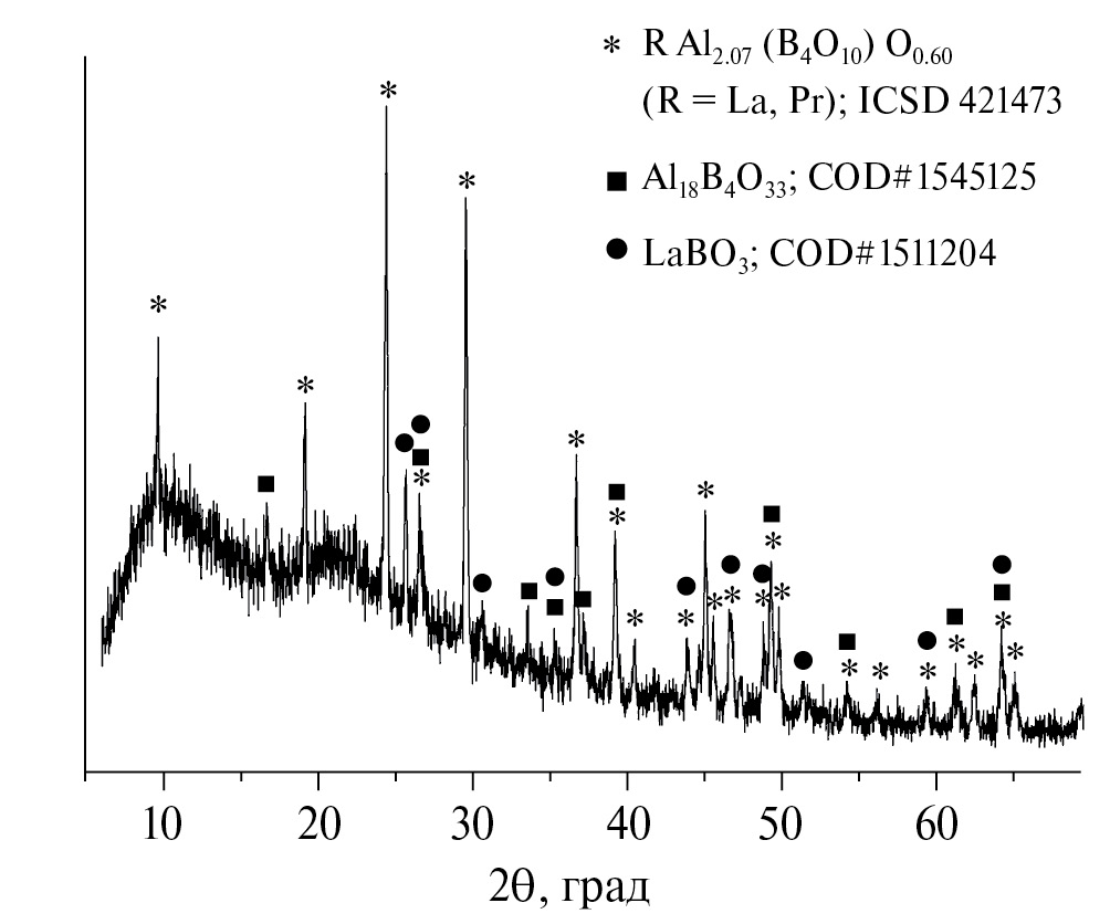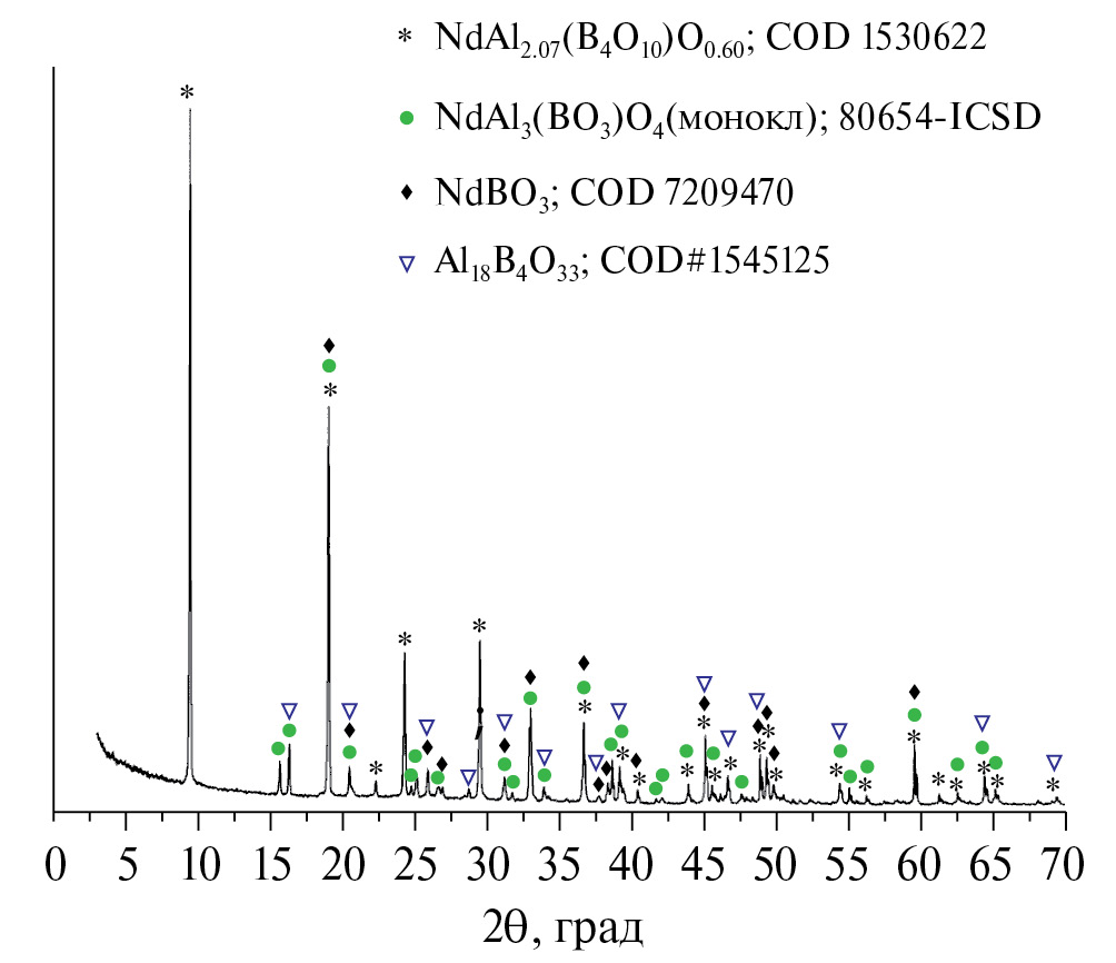 Данные РФА образца Nd-Al-диметабората, отожженного при 980°С в течение 2 сут, подтверждают присутствие в полученном материале Nd-Al-ортобората моноклинной модификации, а также соединений Al18B4O33 и NdBO3 (рис. 9). Однако единичные находки мелких хорошо ограненных кристаллов, представленных на рис. 7в, позволяют предполагать присутствие в продуктах разложения обеих модификаций РЗ-алюминиевого ортобората (моноклинной с пр. гр. С2/с и тригональной с пр. гр. R32).