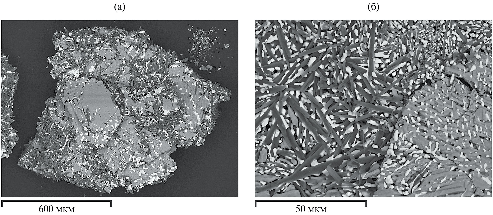 Рис. 8. Изображение в отраженных электронах образца Nd-Al-диметабората после отжига при 980°С в течение 2 сут: продукты разложения (а) и кристаллы Al18B4O33 и NdBO3 (б).