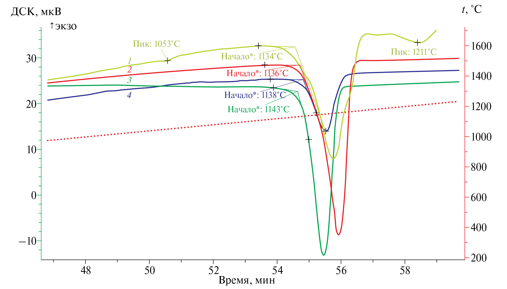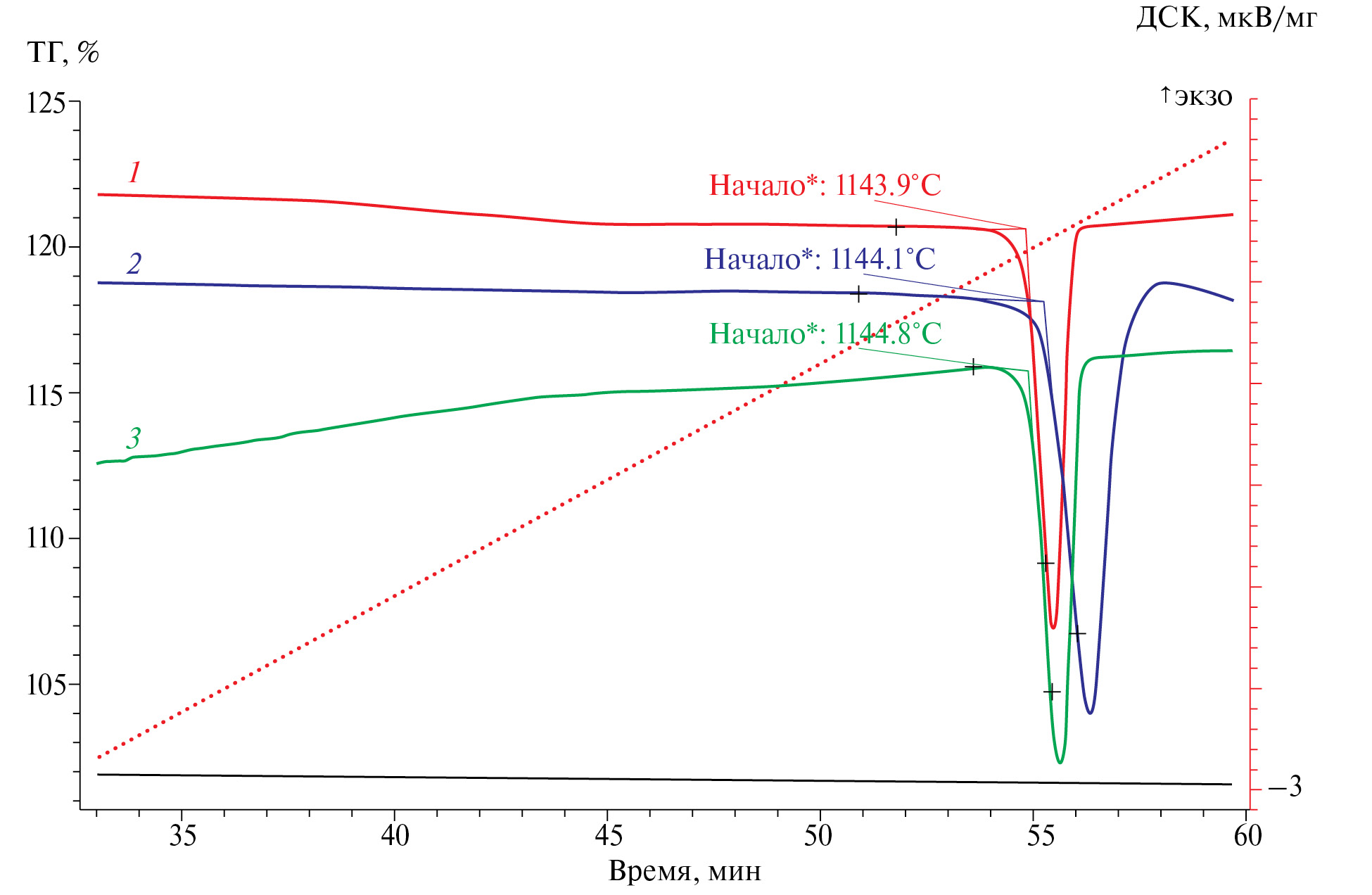 Рис. 10. Сравнительные ДСК-кривые, полученные при скорости сканирования 20°С/мин, и температуры разложения (начала эндотермических реакций) монокристаллического образца La-Al-диметабората, полученные при различных условиях: 1 – Rh–Pt-тигель/аргон; 2 – Al2O3-тигель/воздух; 3 – Rh–Pt-тигель/воздух; черная кривая – ТГ.