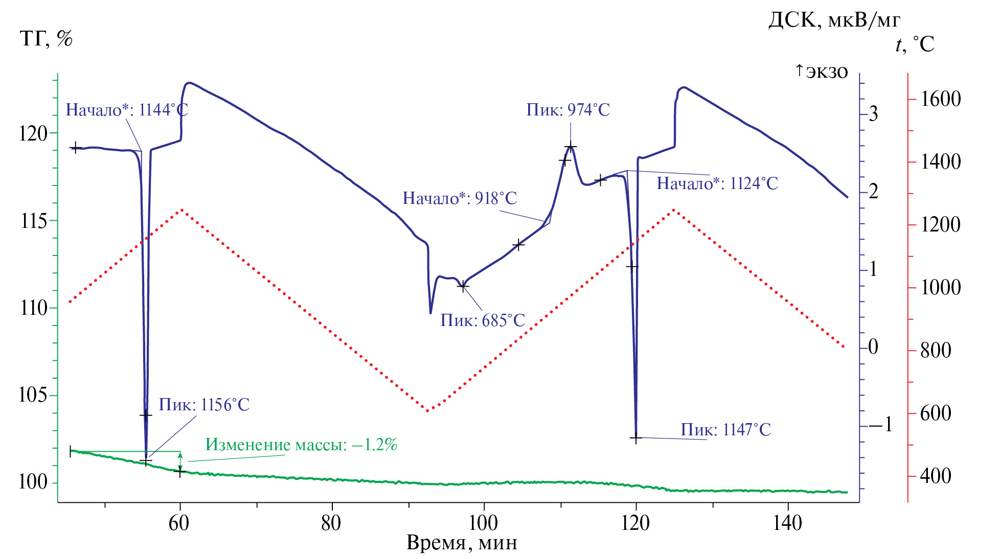 Синтезированные образцы исследовались методами дифференциальной сканирующей калориметрии (ДСК) и термогравиметрического анализа (ТГА) на термоанализаторе STA 449 F5 Jupiter® (Netzsch, Германия). Измерения проводились в атмосфере аргона и воздуха в алундовых и PtRh20-тиглях в температурном диапазоне 50–1250°C со скоростью нагрева 20°C/мин.