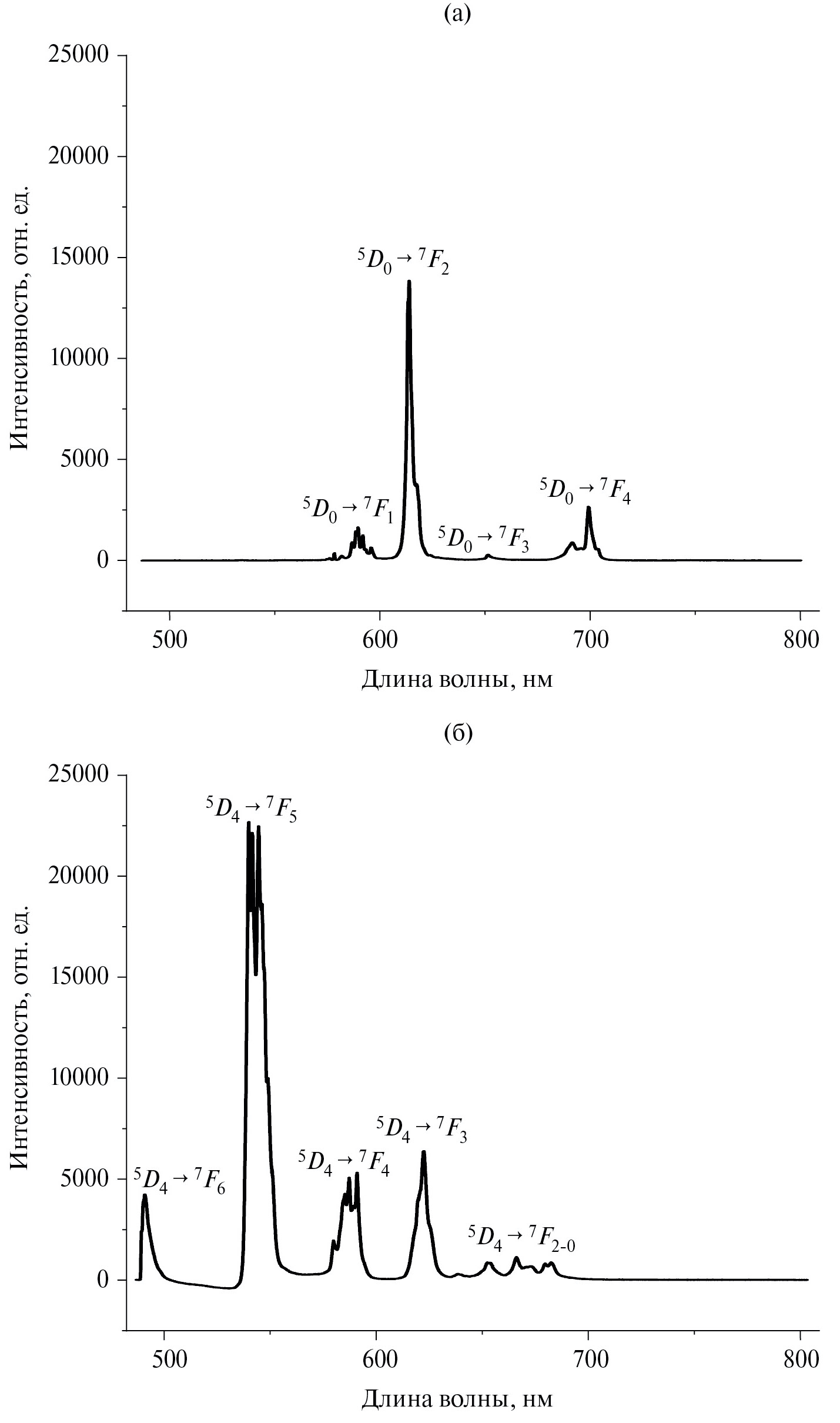 Рис. 14. Спектры ФЛ кристаллов La0.7Eu0.3Al2.07(B4O10)O0.6 (а), La0.7Tb0.3Al2.07(B4O10)O0.6 (б).