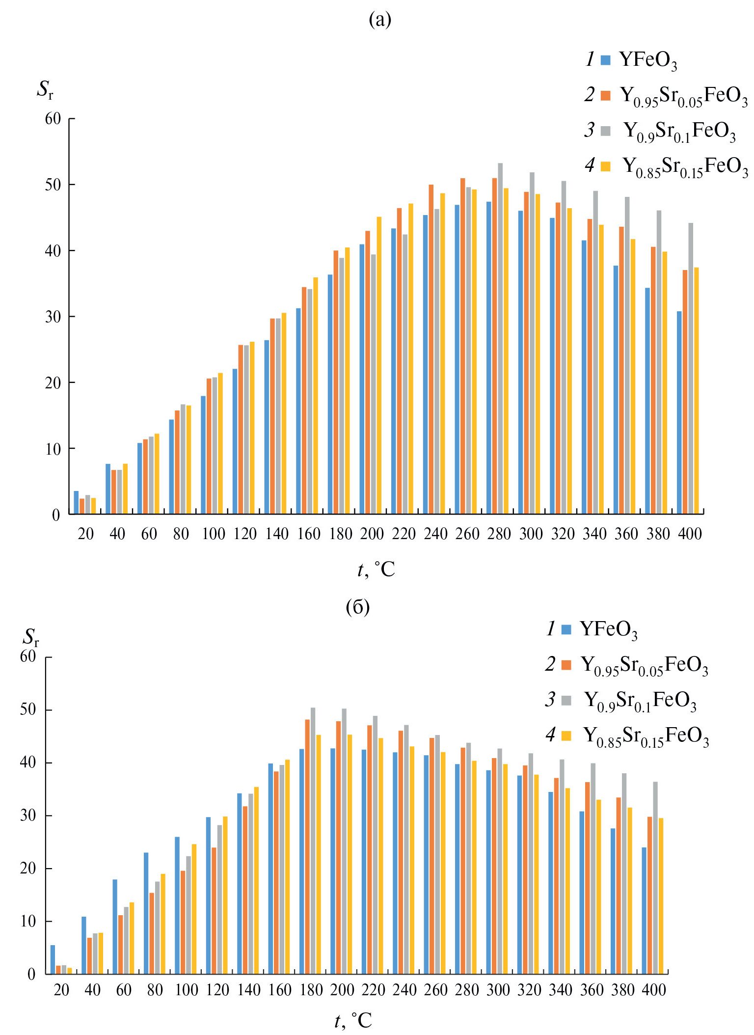 Рис. 5. Сенсорный отклик нанопорошков Y1–xSrxFeO3 в присутствии NH3 (50 ppm) (а), СО (50 ppm) (б).