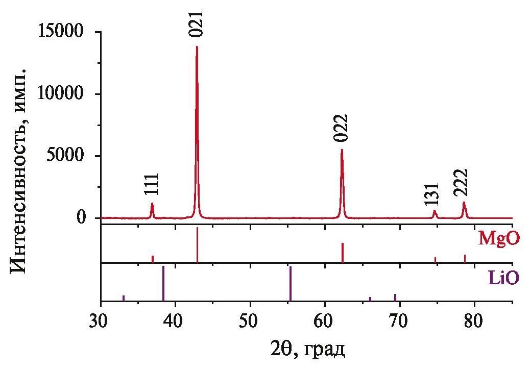 Рис. 1. Дифрактограмма порошка MgO со спекающей добавкой 1 мас.% LiF после прокаливания при 800°С в течение 5 ч.