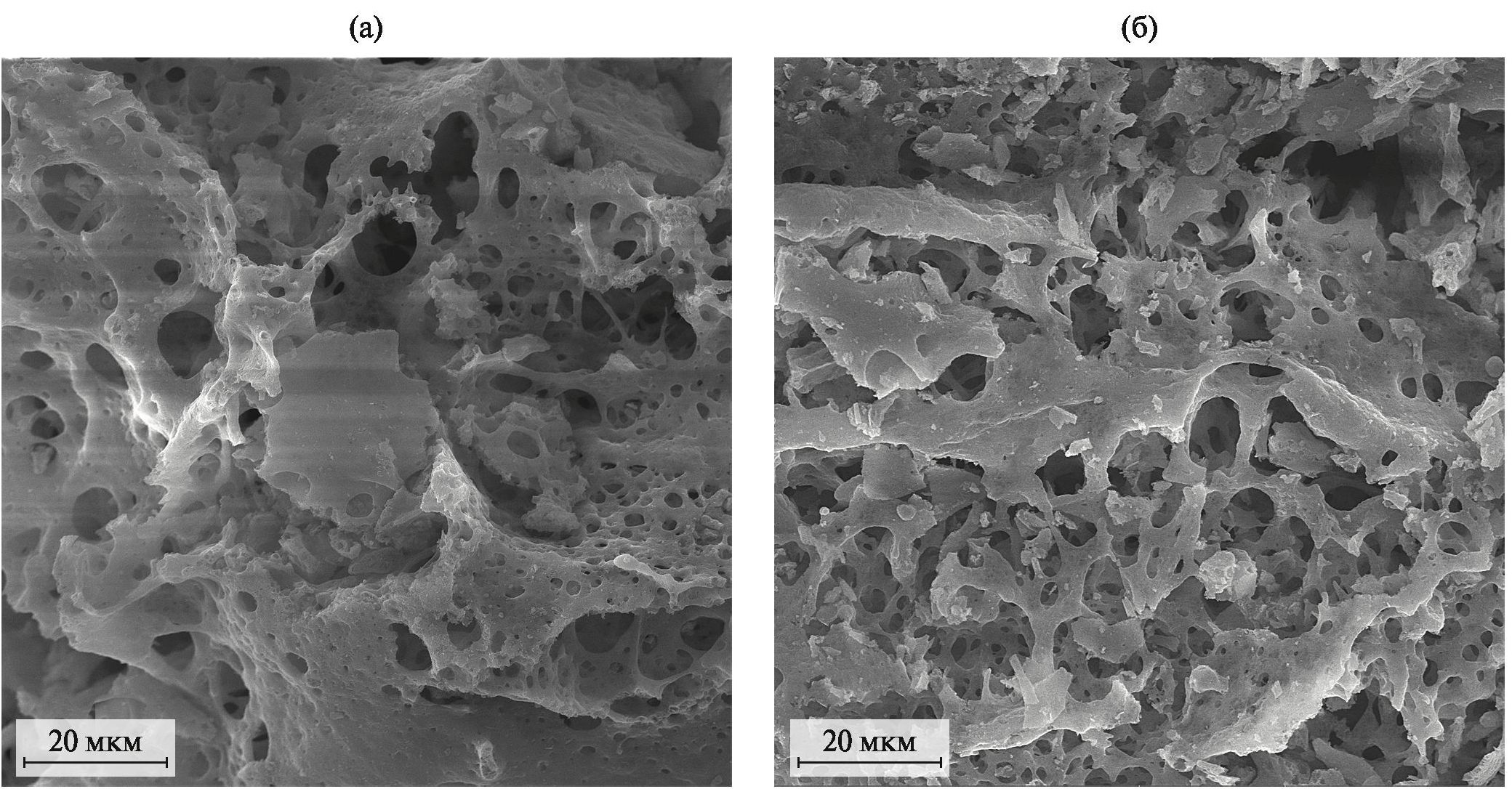 Рис. 2. Микроснимки порошков MgO после СВС (a) и после прокаливания при 800°С в течение 5 ч (б).