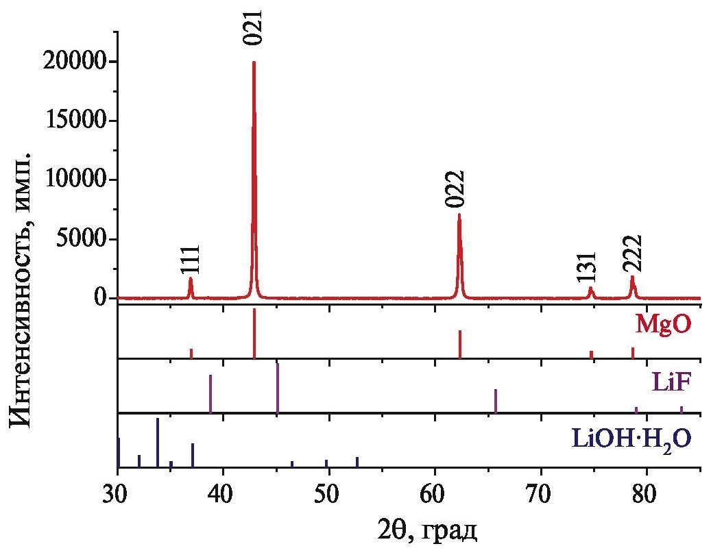 Структурные исследования керамик MgO. На рис. 5 приведена дифрактограмма измельченного в порошок образца керамики MgO, полученной из прекурсора с 1 мас.% спекающей добавки LiF. В процессе горячего прессования спекающая добавка не испаряется полностью, и на дифрактограммах обнаруживаются следовые количества фторида лития и гидроксида лития. Как будет показано ниже, наличие примесей в керамике обнаруживается также по зависимостям теплопроводности от температуры.
